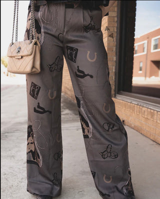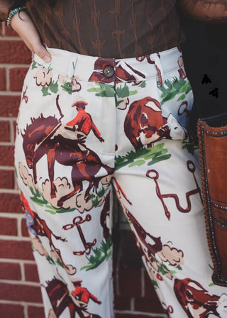 2 Fly Trail Trousers – Western Print Statement Trouser Pants with Horse & Roping Design