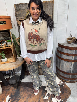 2 Fly “Buck Yeah” Bronc Rider Graphic Sweater Vest | Western Statement Knit