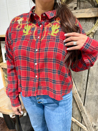 Rodeo Trails Embroidered Cropped Flannel Plaid Shirt – Red Western Button-Up with Cactus & Boot Design