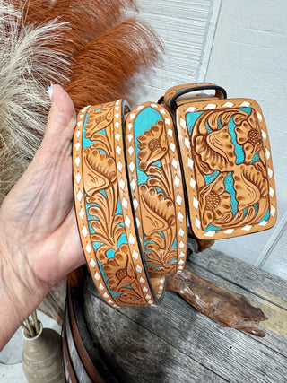 Hand-Tooled Western Leather Belt with Buck Stitch Detail – Floral Carved Cowgirl Belt-138