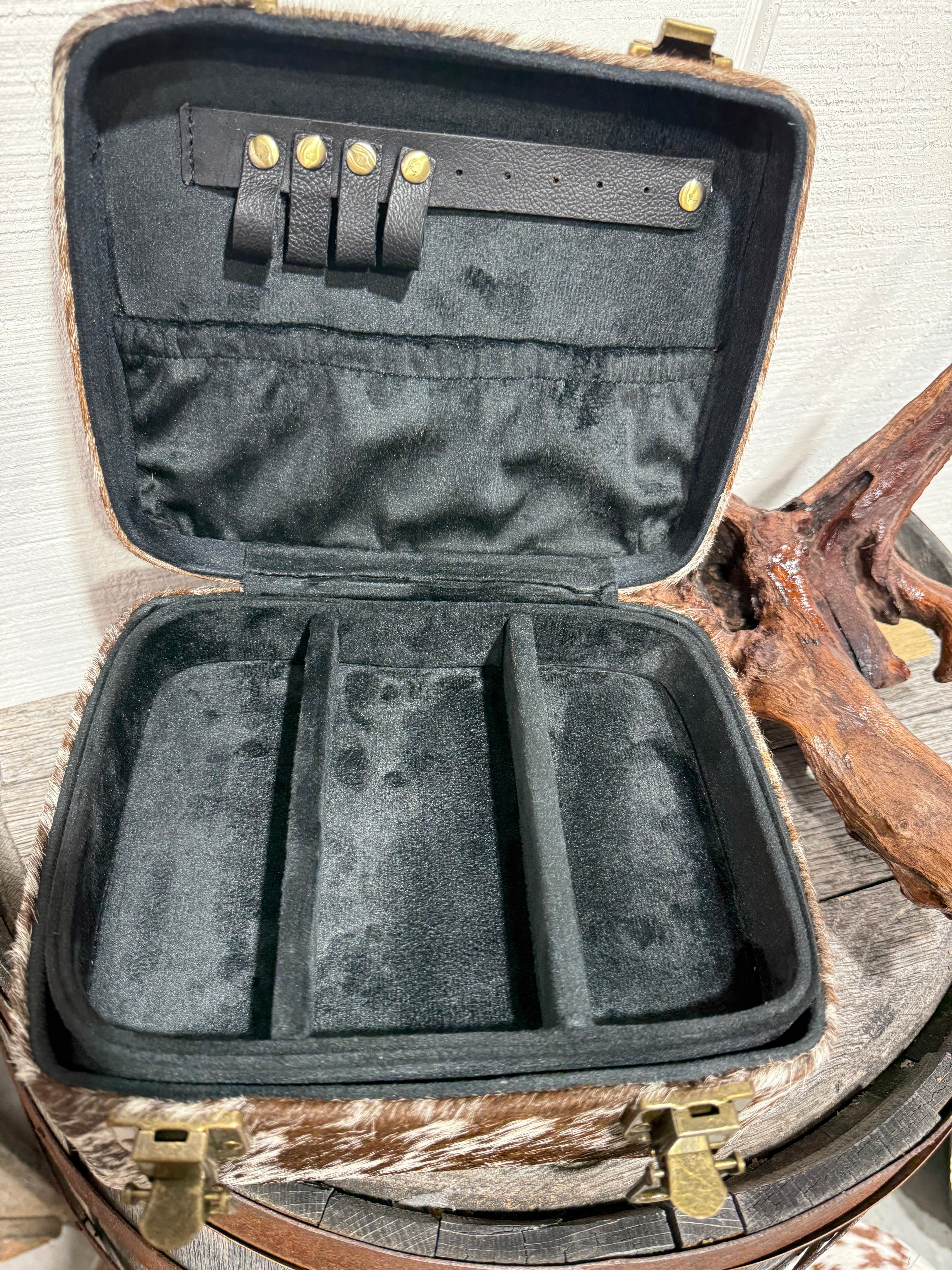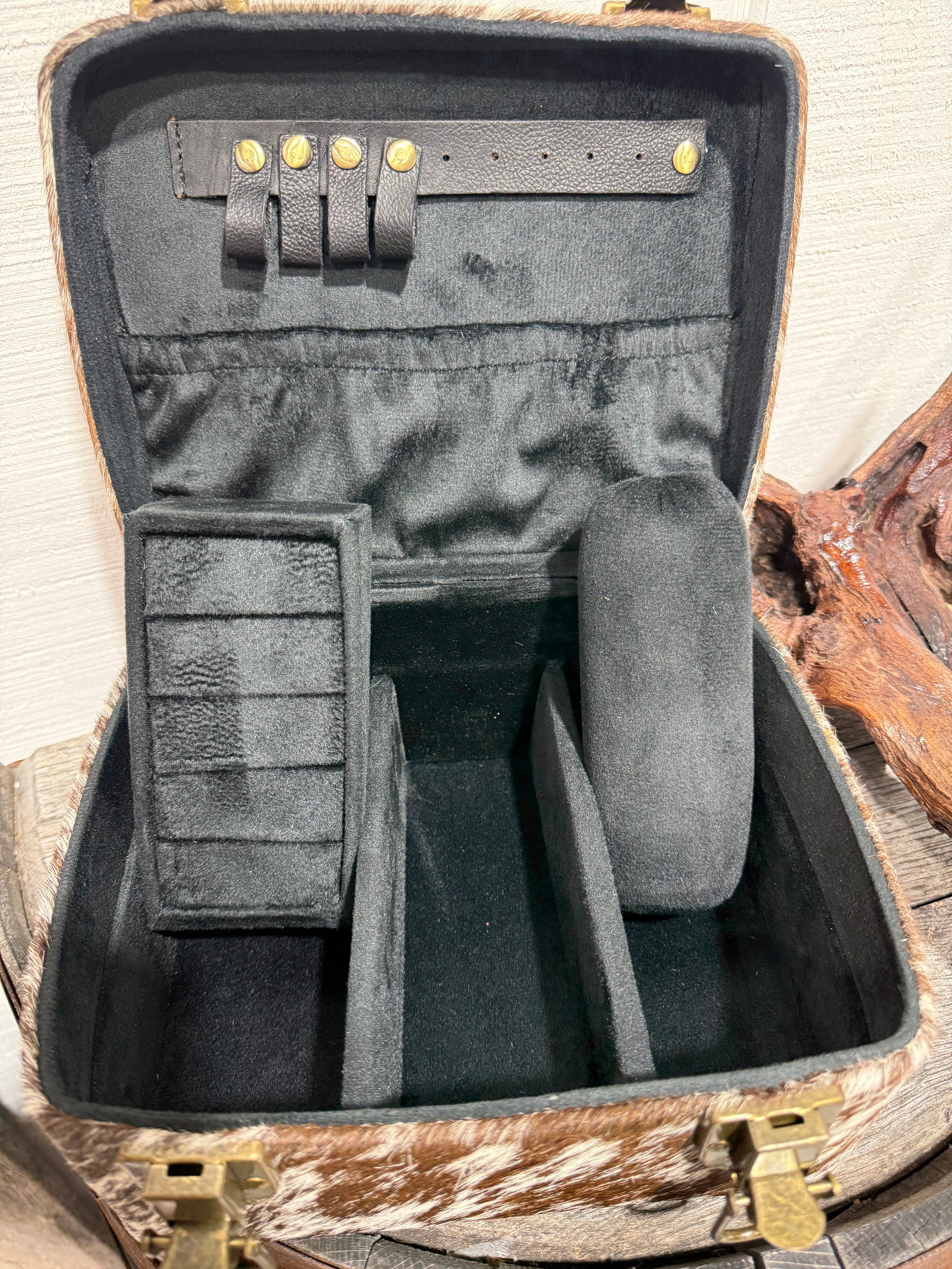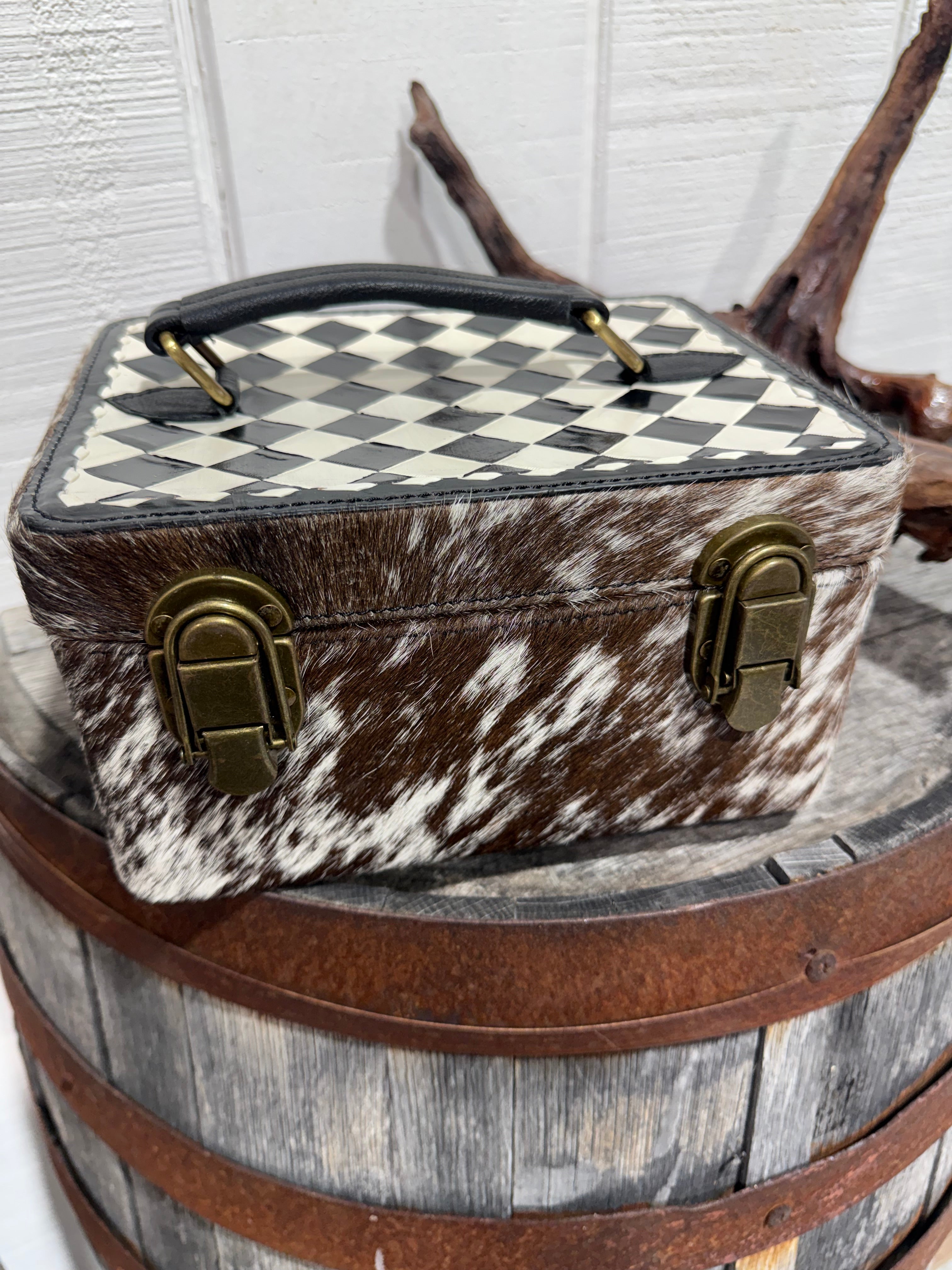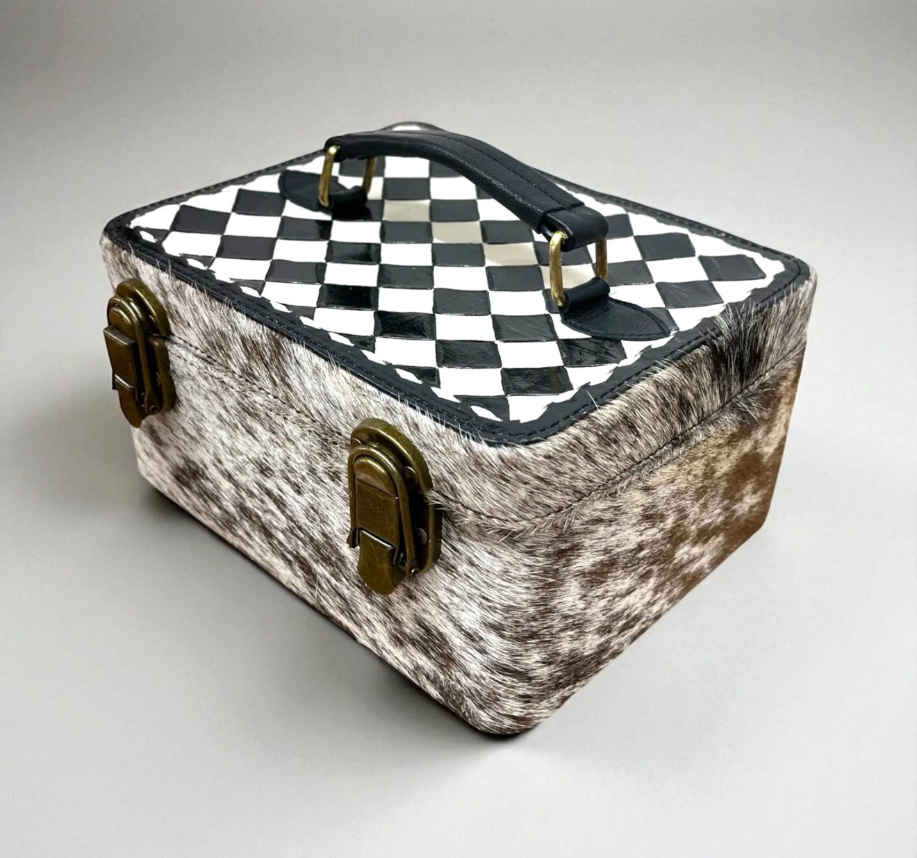 This beauty is the definition of western meets edgy modern. Our Checkerboard Cowhide Jewelry Case pairs genuine hair-on hide with a bold black-and-white checkerboard tooled leather lid — a statement piece that keeps your jewelry organized and protected whether you’re home, rodeo-running, or NFR-bound.