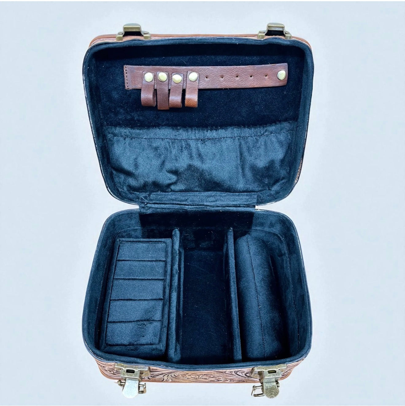 • Leather jewelry loops on the lid to secure earrings, pendants, or chains