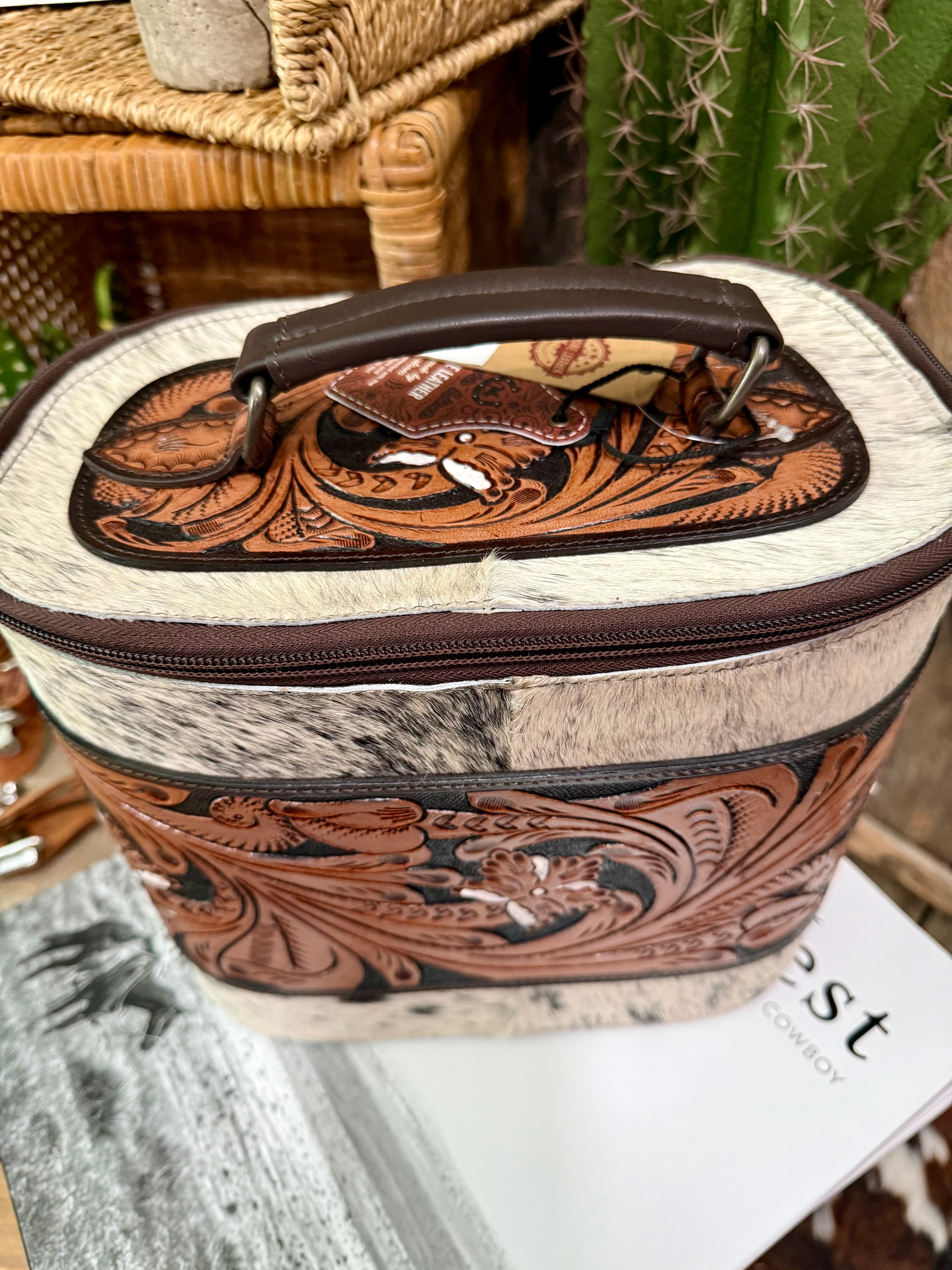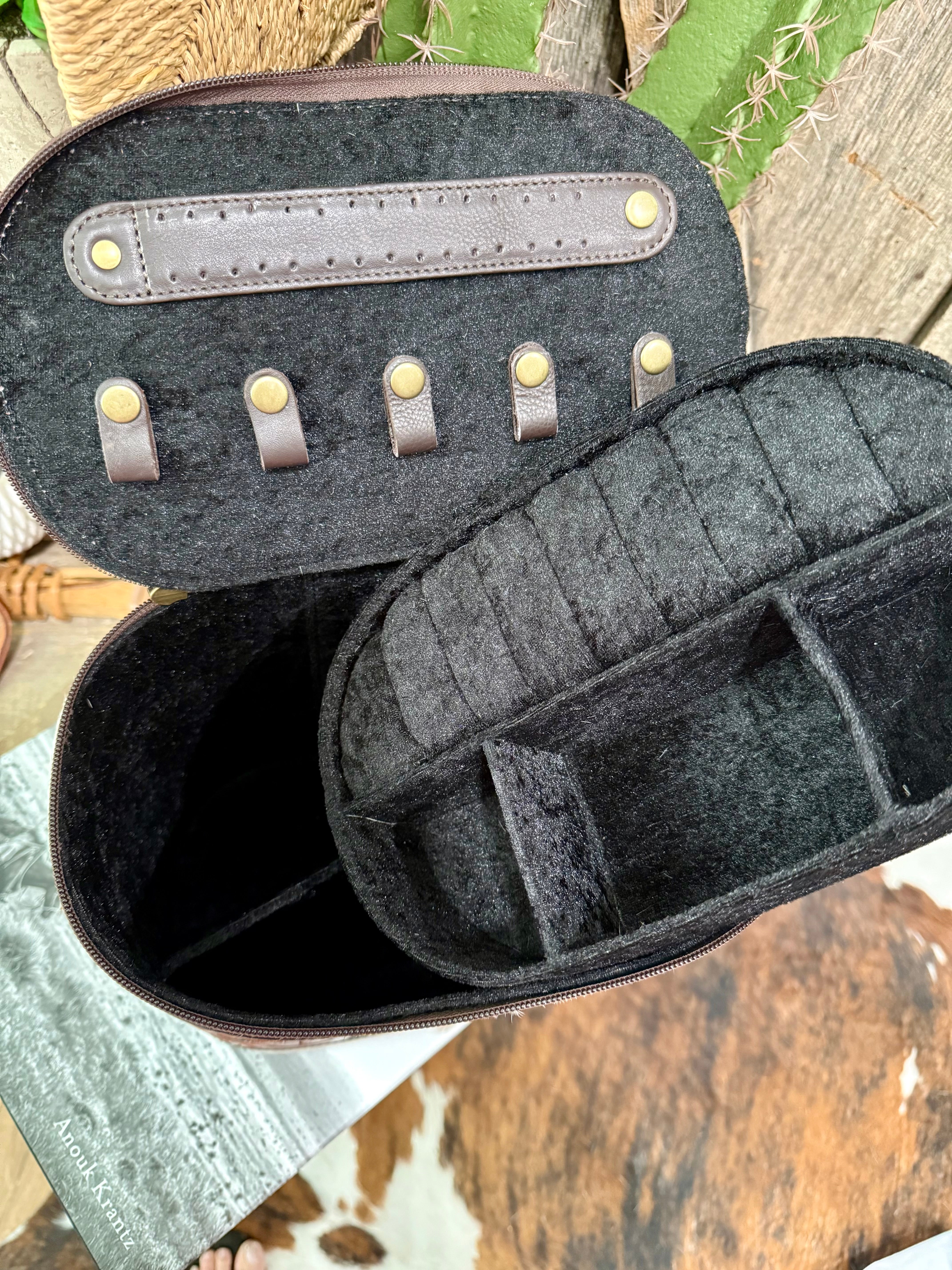 Keep your beauty and jewelry essentials organized in western style with this stunning cowhide and tooled leather combo box. Crafted with genuine hair-on hide and intricately hand-tooled floral leather accents, this large structured case features a secure zip closure and sturdy leather handle for easy carrying. Inside, you’ll find multiple compartments, ring slots, and snap-strap holders to keep your necklaces, earrings, rings, and remove the top tray and keep all your makeup neatly in place. A 2 n 1 find!!