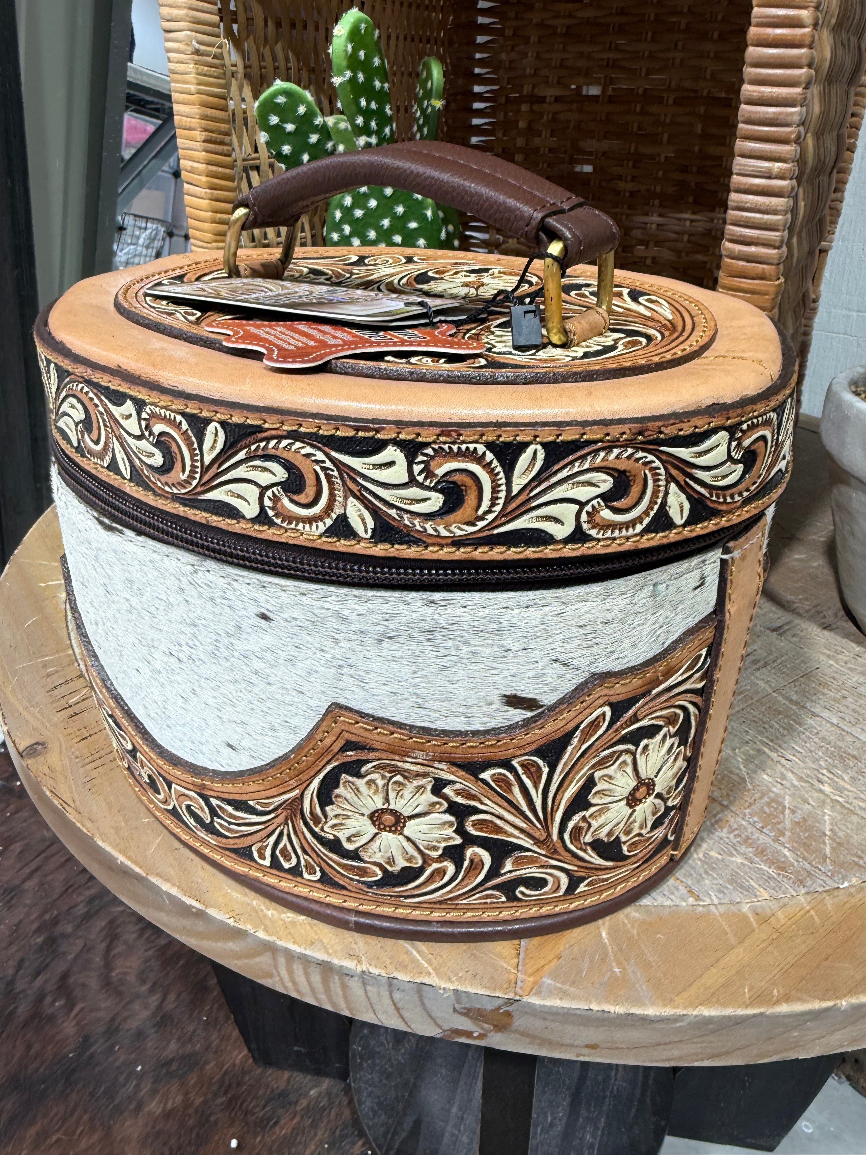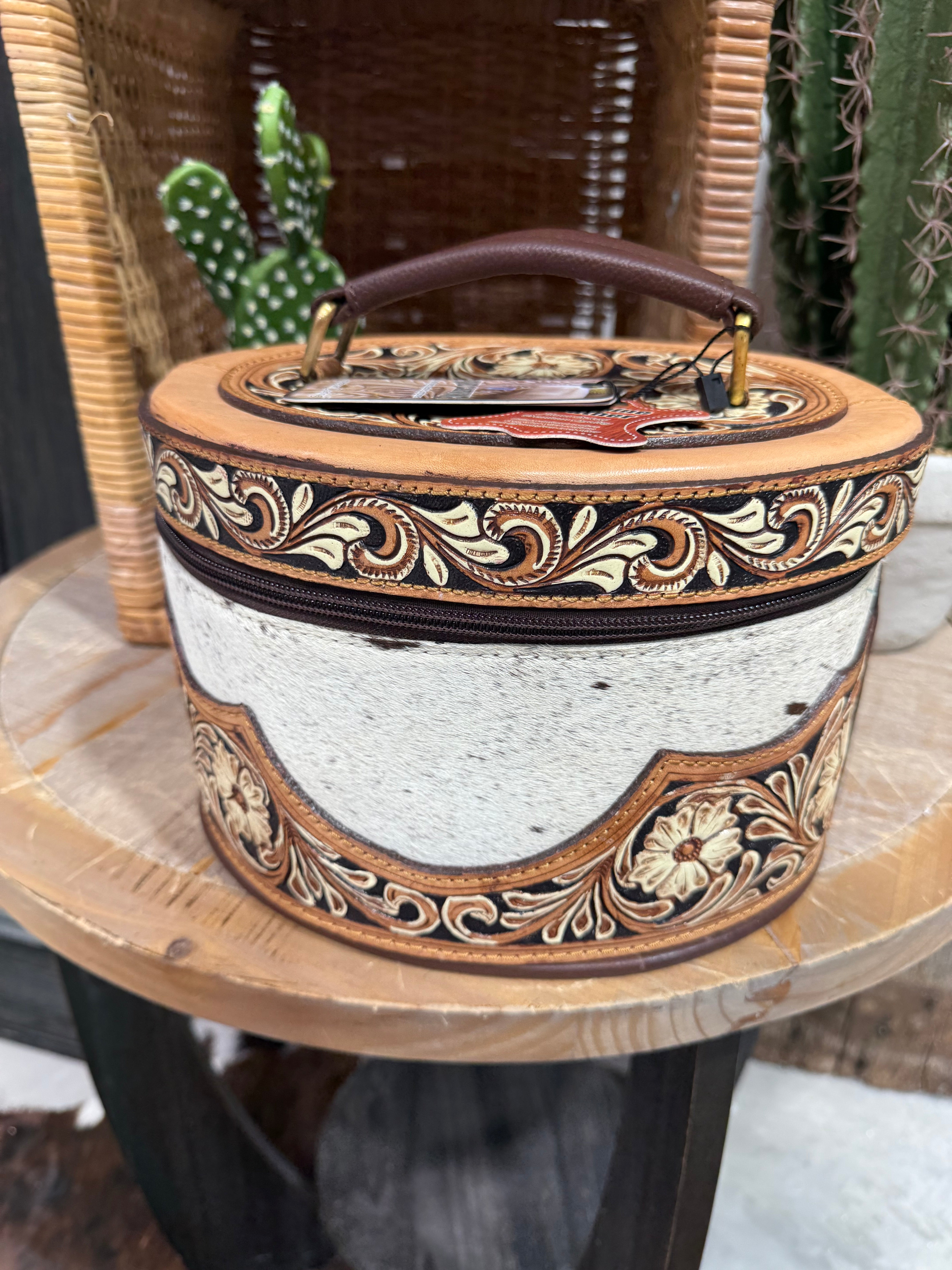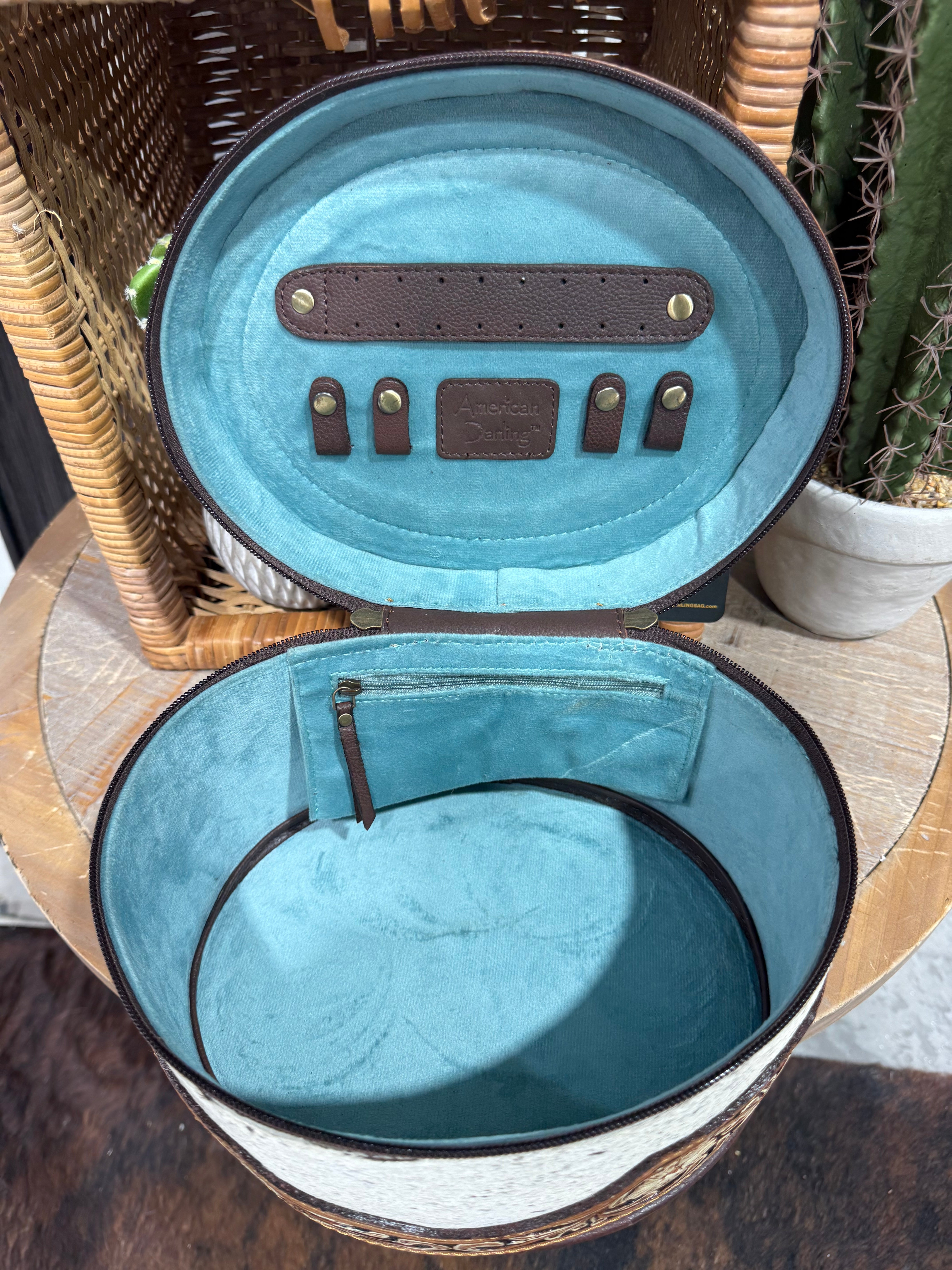 The structured oval design features a smooth zipper closure, sturdy leather handle, and turquoise suede-lined interior complete with pockets and strap loops for jewelry, makeup, or travel accessories. Whether you use it at home, on the road, or as a statement piece in your boutique-style décor, this Western vanity case is as durable as it is beautiful.