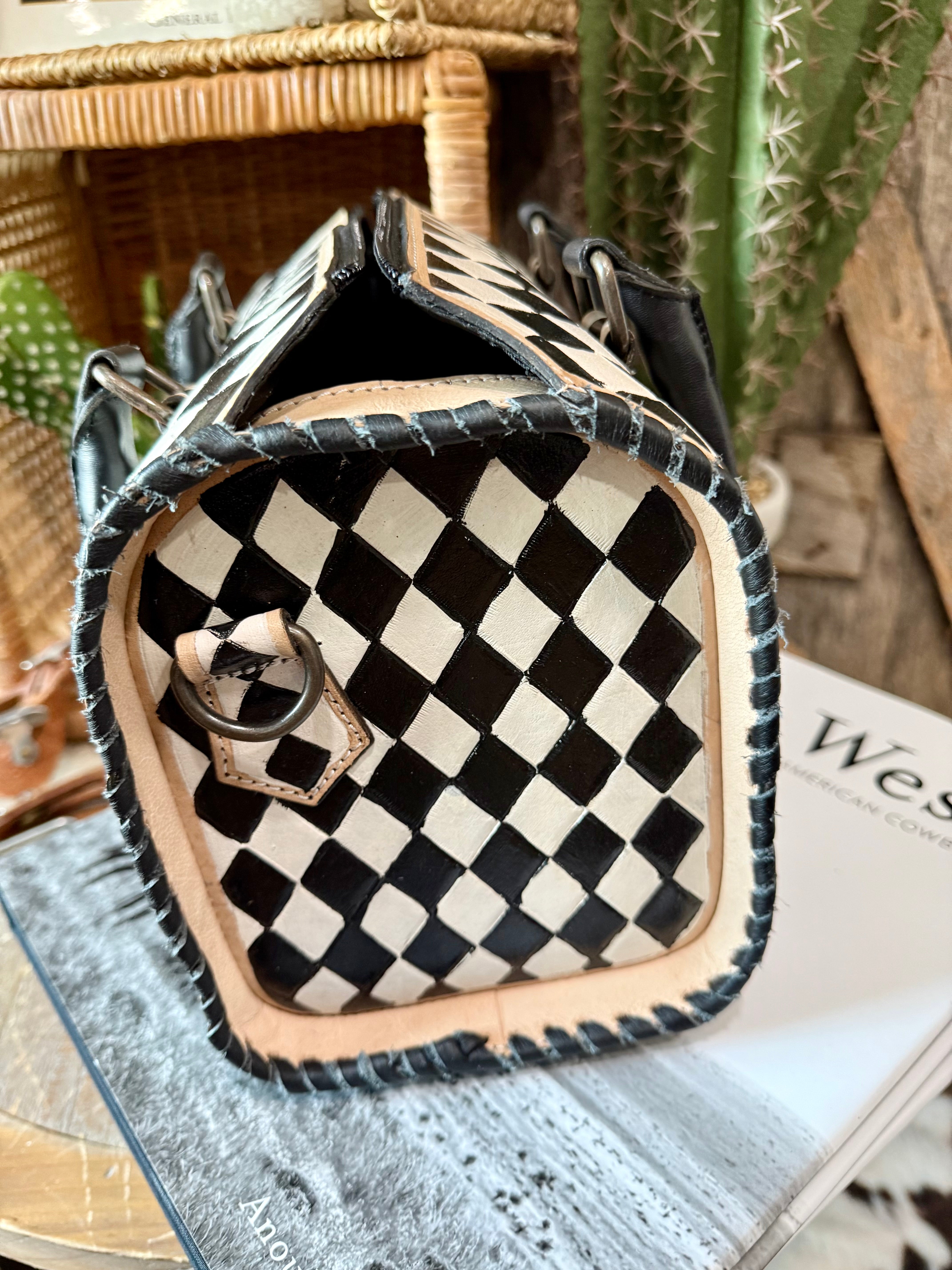 Make a bold statement with this handcrafted medium-sized Speedy bag, featuring a striking black and white checkered design. Each bag is hand-painted and finished with detailed leather stitching, giving it a unique artisan touch. The structured silhouette, sturdy handles, and roomy interior make it perfect for everyday use while still offering standout western flair. Whether paired with casual denim or a dressy look, this bag adds the perfect mix of classic style and modern edge