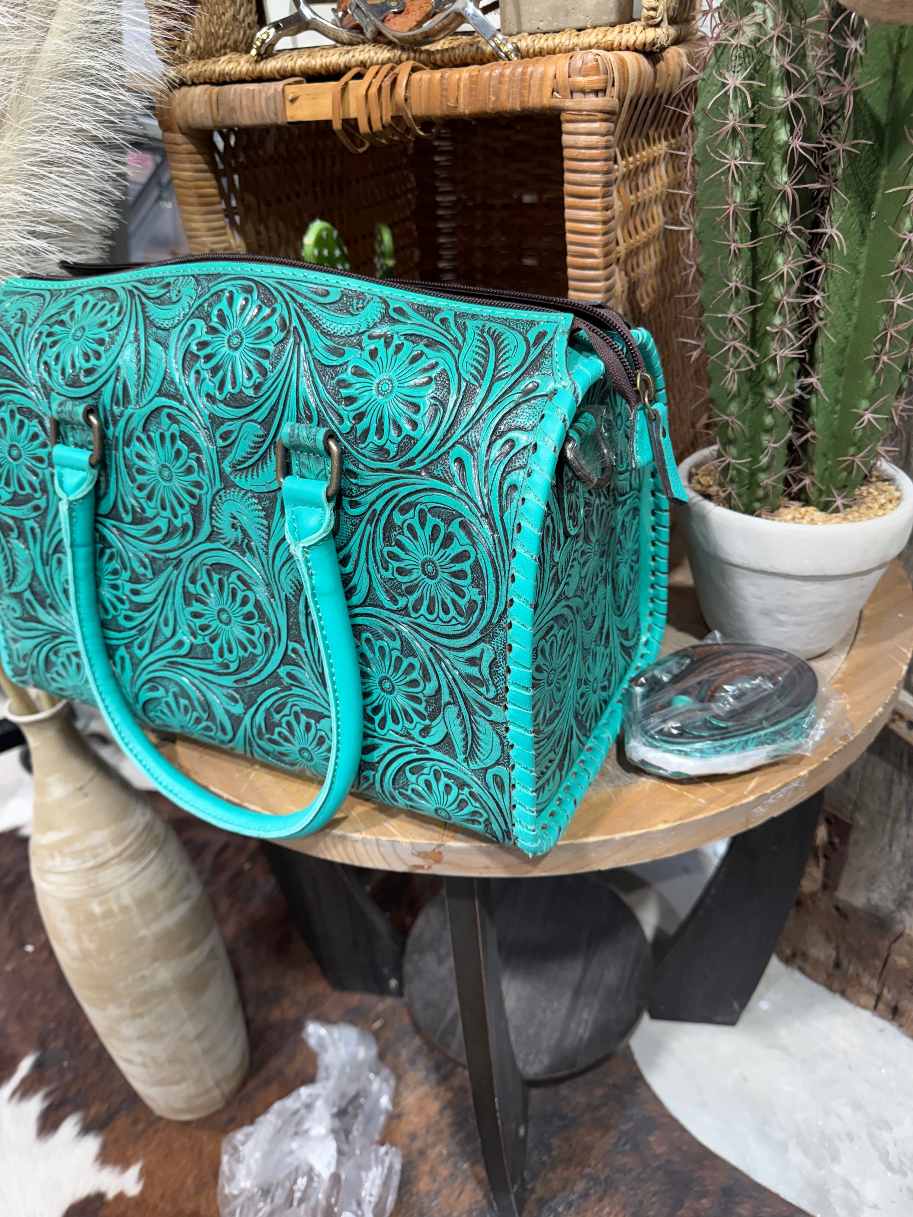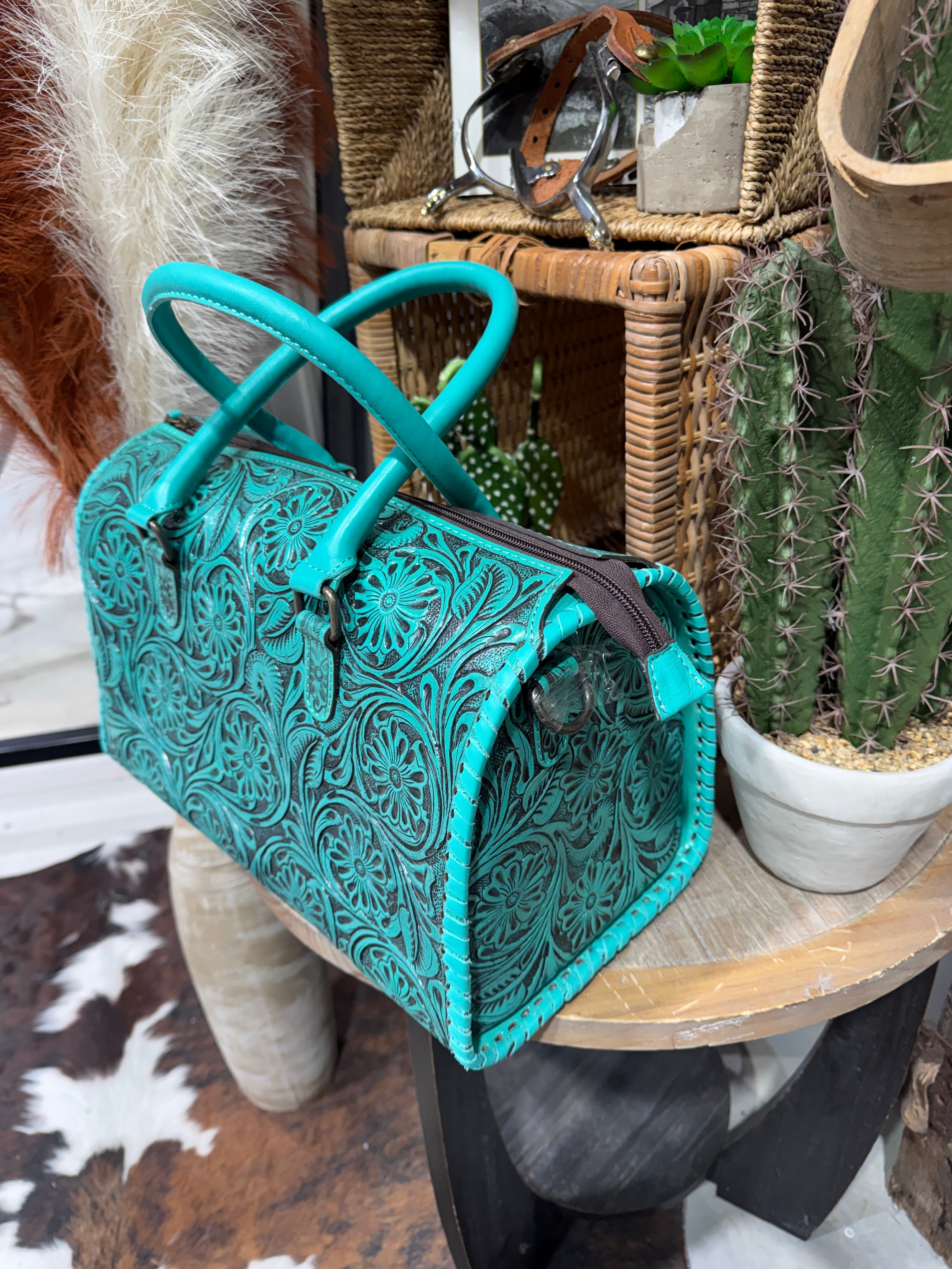 Crafted for the western soul with a love for florals, this speedy bag features hand-tooled leather with a rich turquoise wildflower design. The structured silhouette is timeless, while the detachable tooled strap adds function and flair. Whether you’re two-steppin’ or road trippin’, this beauty is built to turn heads.