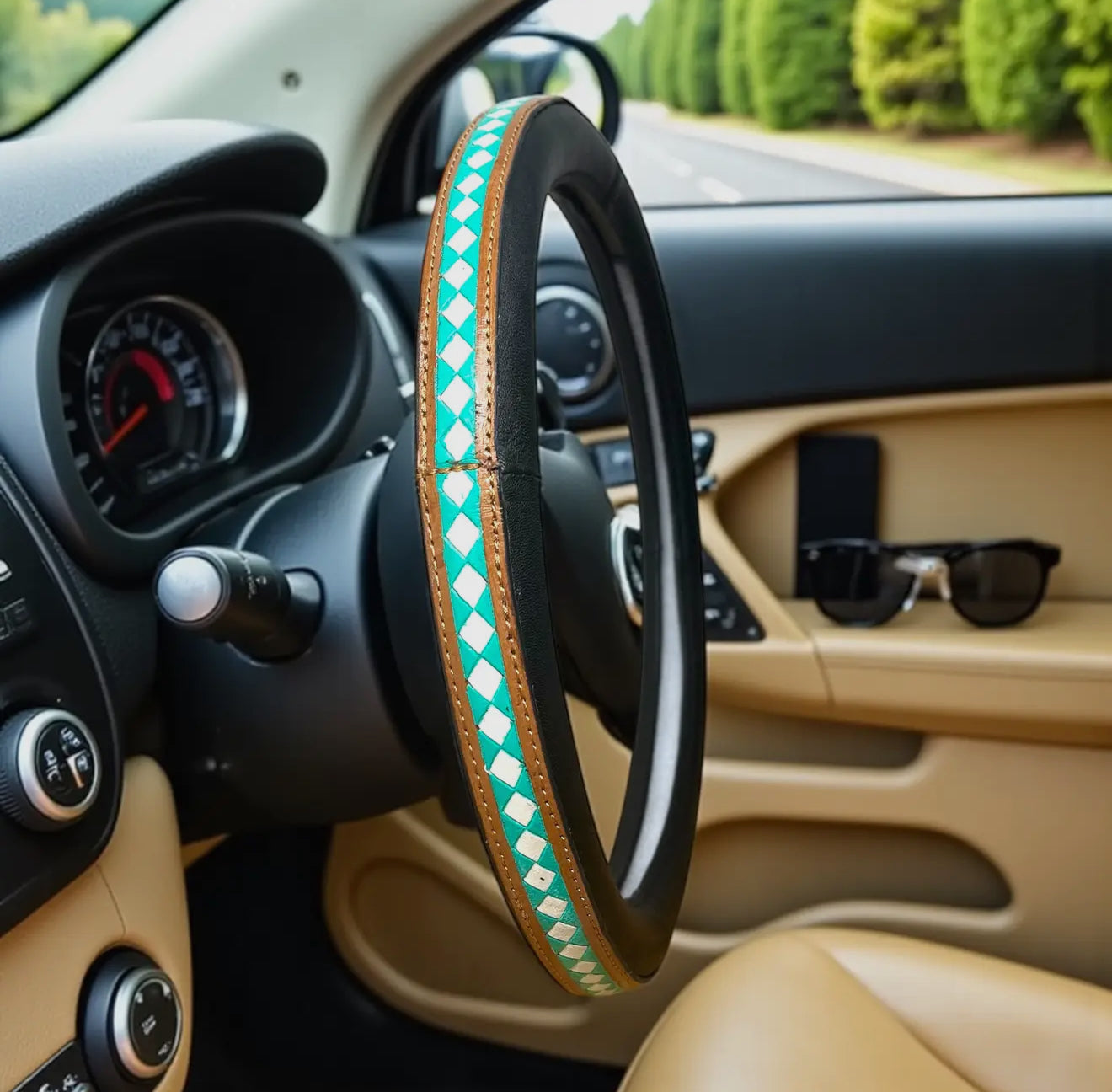 Hit the road in western style with this tooled leather steering wheel cover, featuring hand-tooled checkered patterns .