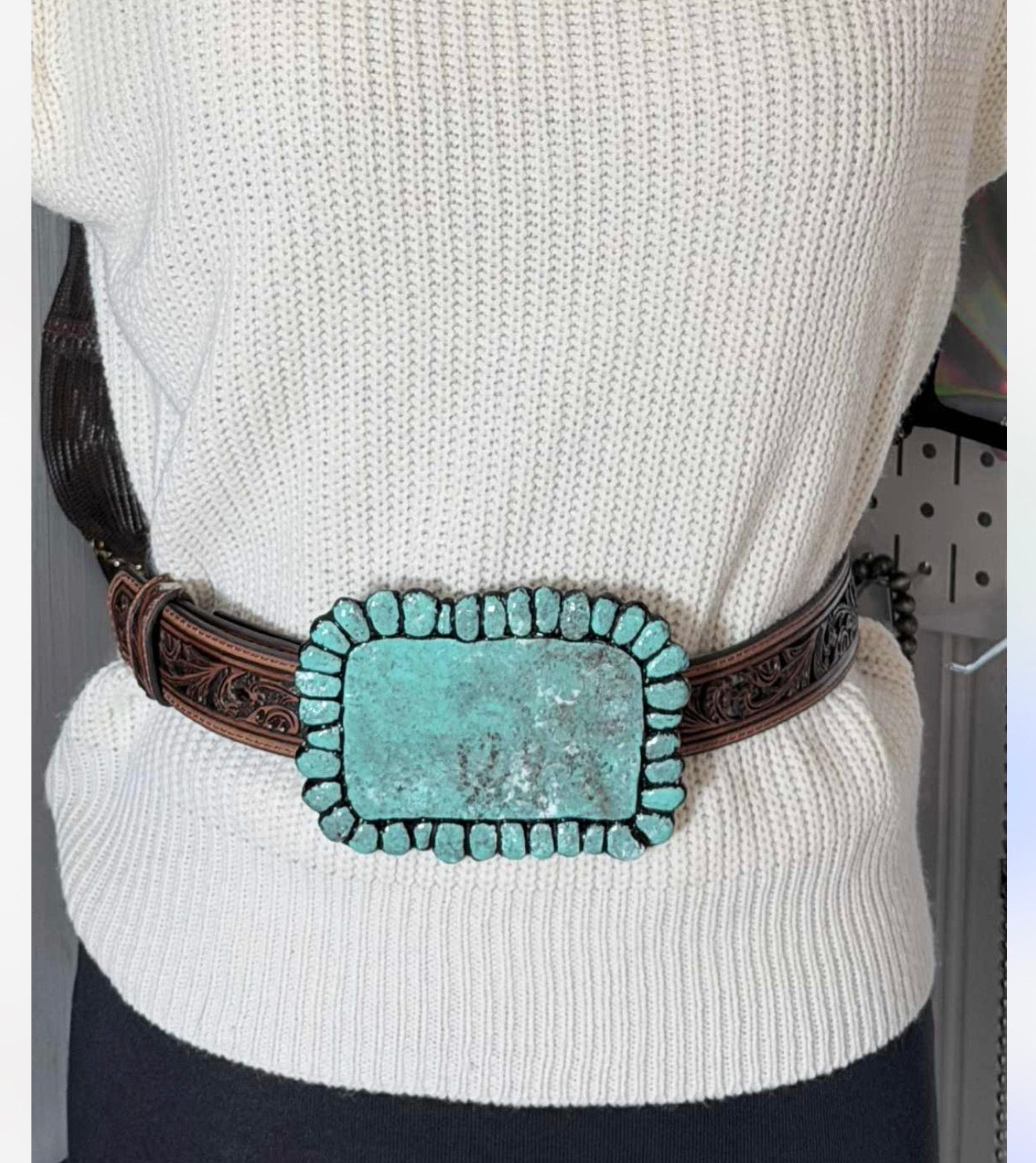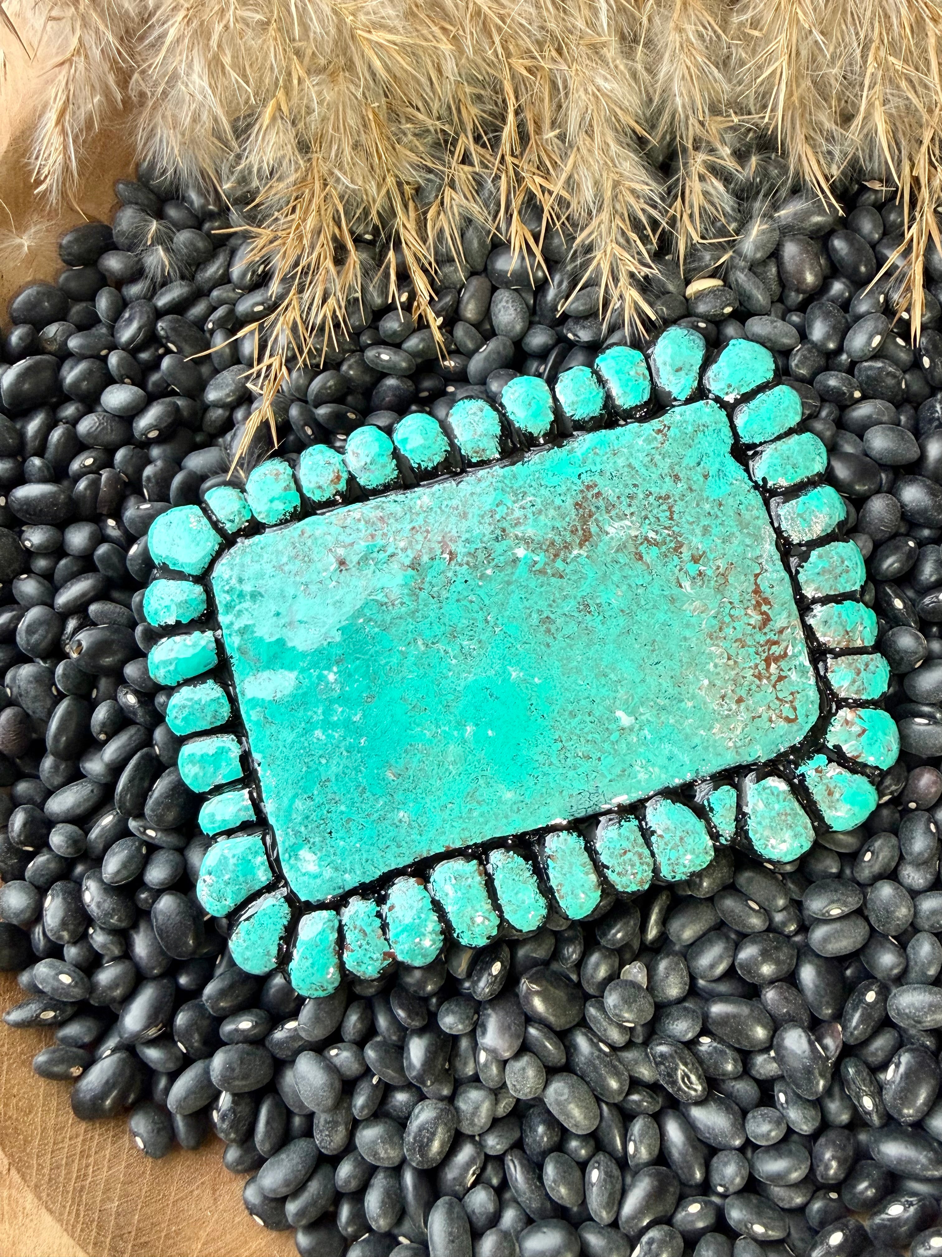 Each “stone” is individually sculpted by hand, giving this piece incredible character, texture, and rustic charm you simply cannot mass-produce. The distressed turquoise finish and organic edges create an authentic cowgirl aesthetic that pairs beautifully with leather belts, denim, sweaters, and dresses.
