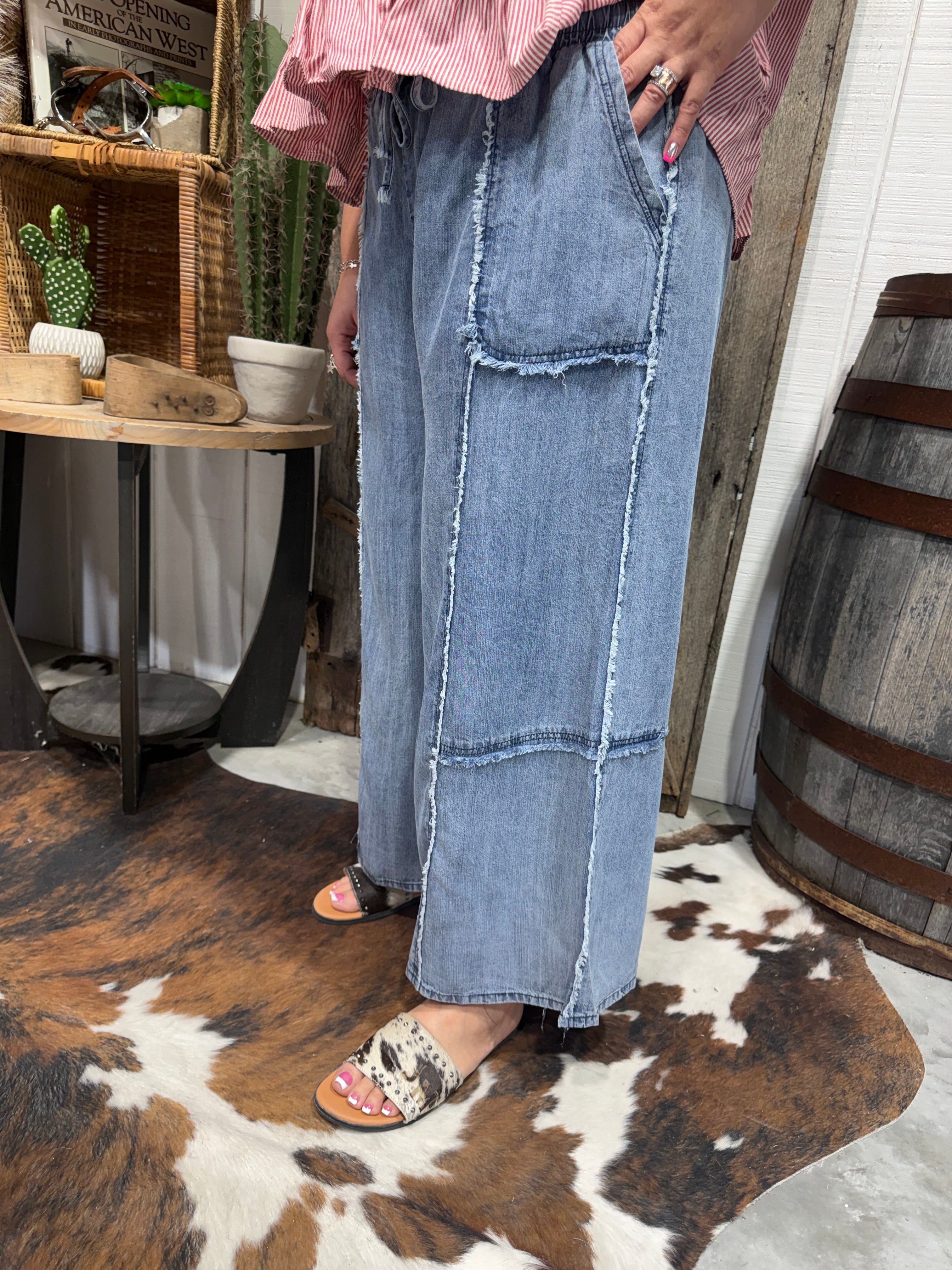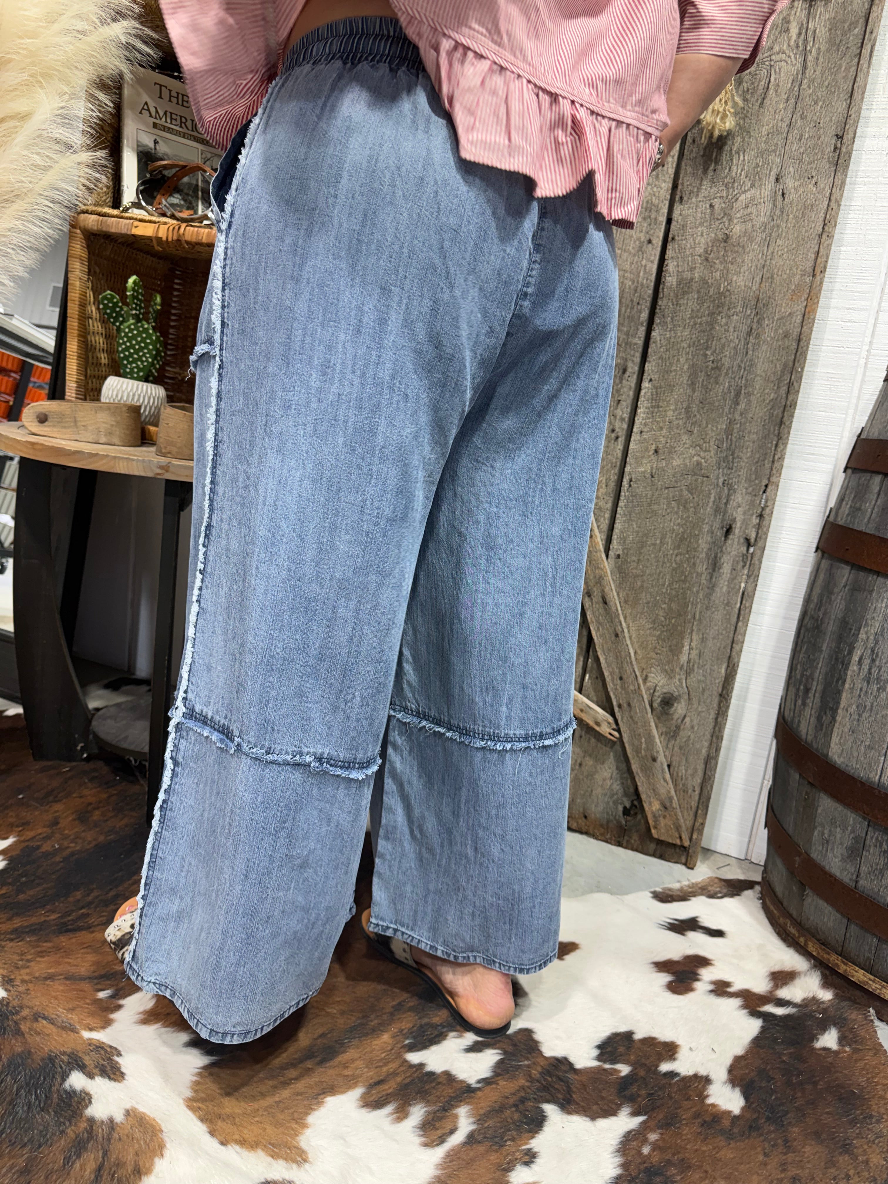 Comfort meets effortless style with these high-waisted wide leg chambray crop pants, designed for easy everyday wear. Crafted from 100% Tencel chambray, they’re lightweight, breathable, and ultra-soft with a relaxed, lived-in feel. The elasticized waistband with an adjustable drawstring provides a comfortable fit, while the wide leg silhouette and subtle frayed edge detailing add a touch of laid-back character.