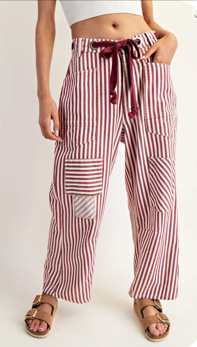 Upgrade your casual wardrobe with these red and white canvas striped barrel pants, designed with a relaxed yet structured fit. Featuring a drawstring waist with oversized grommets, roomy front and back patch pockets, and unique mixed patchwork detailing, these pants blend effortless comfort with standout style. The wide barrel leg silhouette makes them perfect for laid-back days while still keeping your look chic and elevated