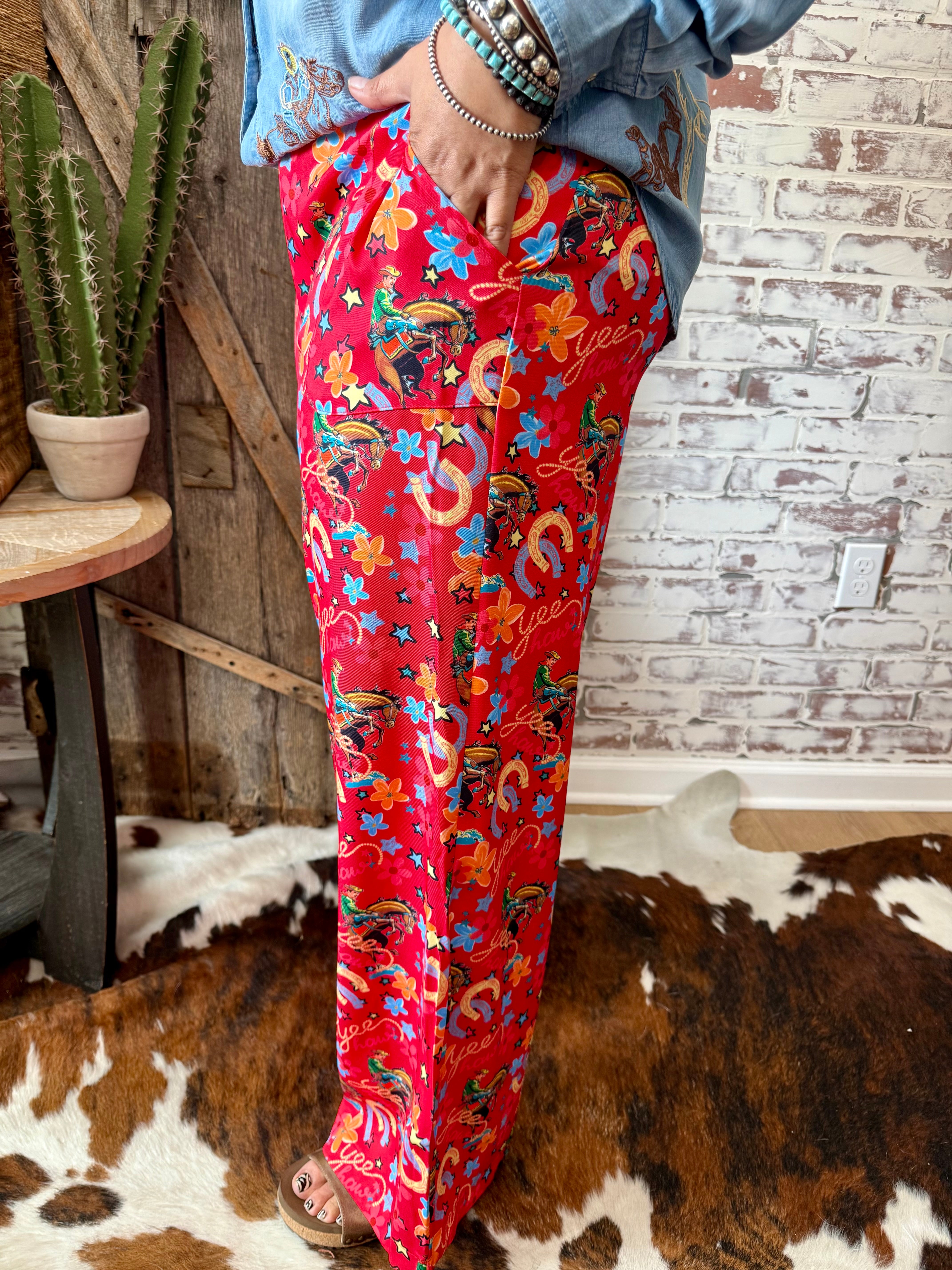 Make a statement in true rodeo-ready fashion with these punchy red wide-leg pants. Designed with vibrant all-over western graphics, they feature cowgirls on horseback, horseshoes, lassos, stars, florals, and playful “Yeehaw” prints for that perfect mix of fun and sass. The relaxed wide-leg fit makes them as comfortable as they are eye-catching, while the bold colors guarantee you’ll stand out in any crowd. Pair them with a denim shirt, graphic tee, or a fringe jacket for the ultimate cowgirl-chic look. Perfect for concerts, festivals, rodeos, or just adding some western flair to your everyday style, these pants were made for bold souls who love to celebrate the western way of life.