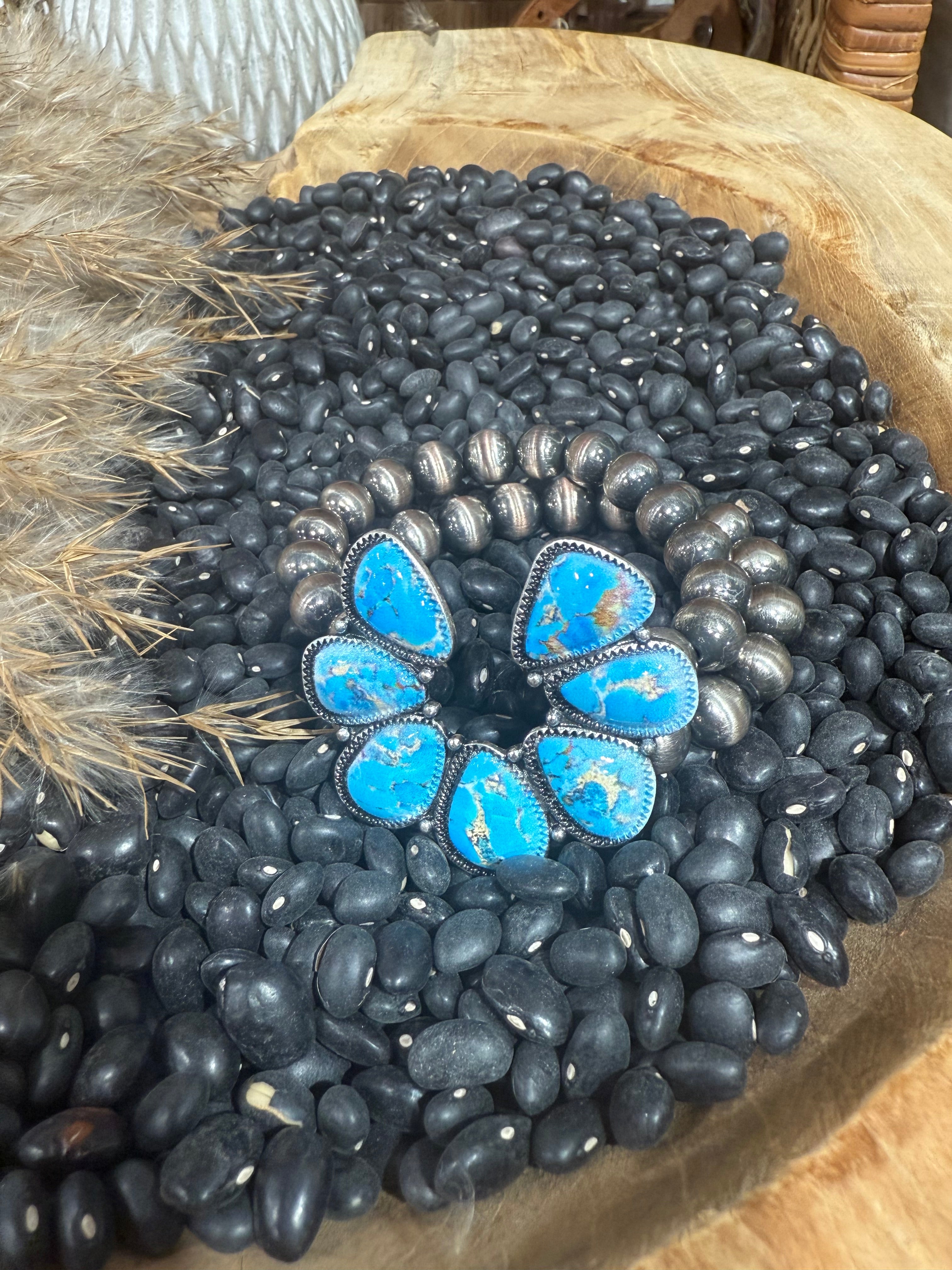Show off your western flair with this striking faux Kingman turquoise cluster bracelet. Each teardrop stone shines with unique golden matrix patterns, set in oxidized silver with Navajo pearl-style beads for a classic southwestern finish. The stretch fit makes it easy to wear for rodeo days, nights out, or everyday cowgirl charm.