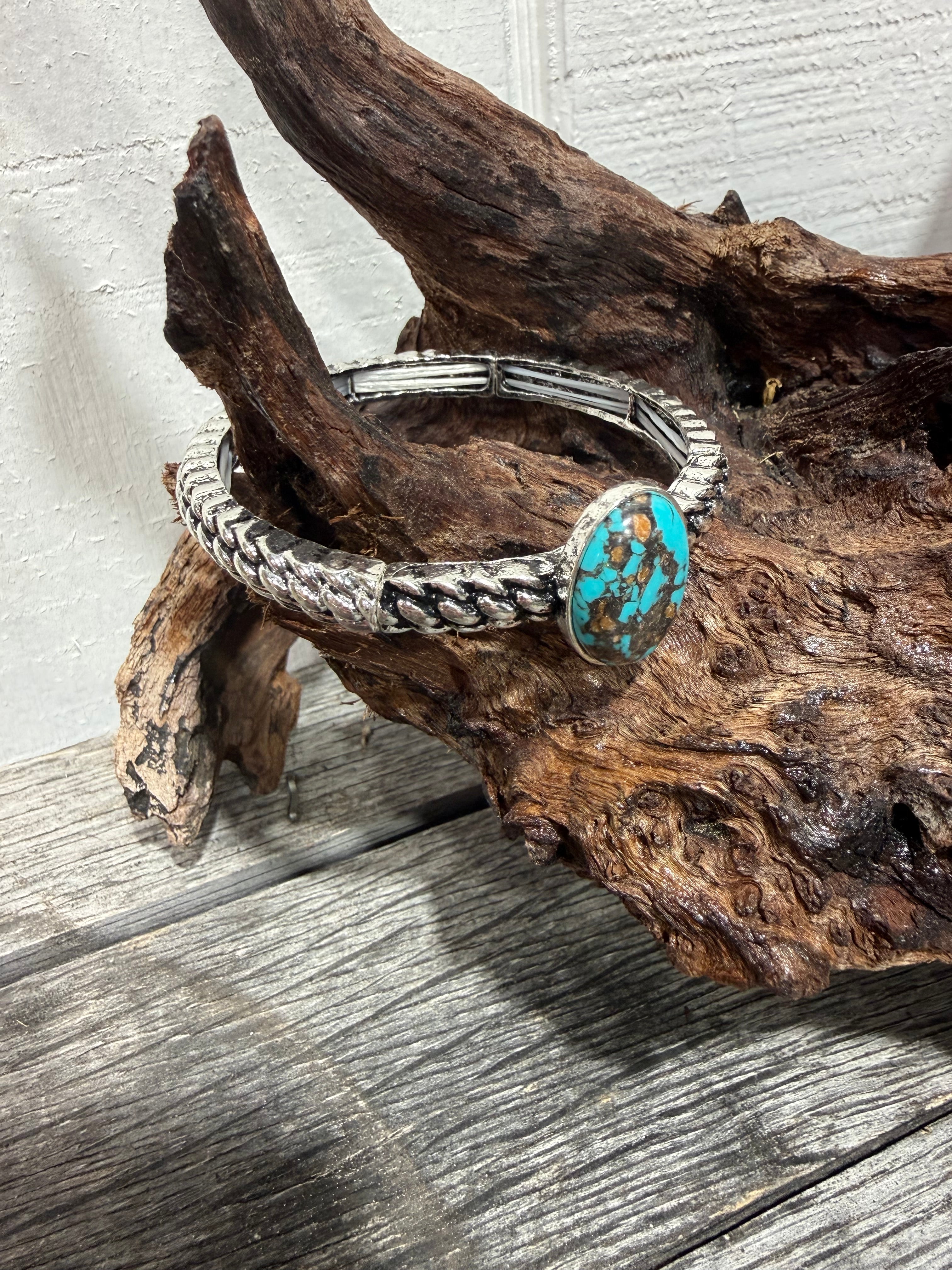 Make a bold western statement with this stretch turquoise oval rope cuff bracelet, designed for effortless cowgirl style. Featuring a vibrant turquoise-look stone set in a textured rope-style cuff, this piece brings classic Southwestern charm with a modern fashion-jewelry finish. The faux silver tone adds an aged western look without the weight or price of fine metals, making it perfect for everyday wear, rodeo nights, or stacked bracelet looks.