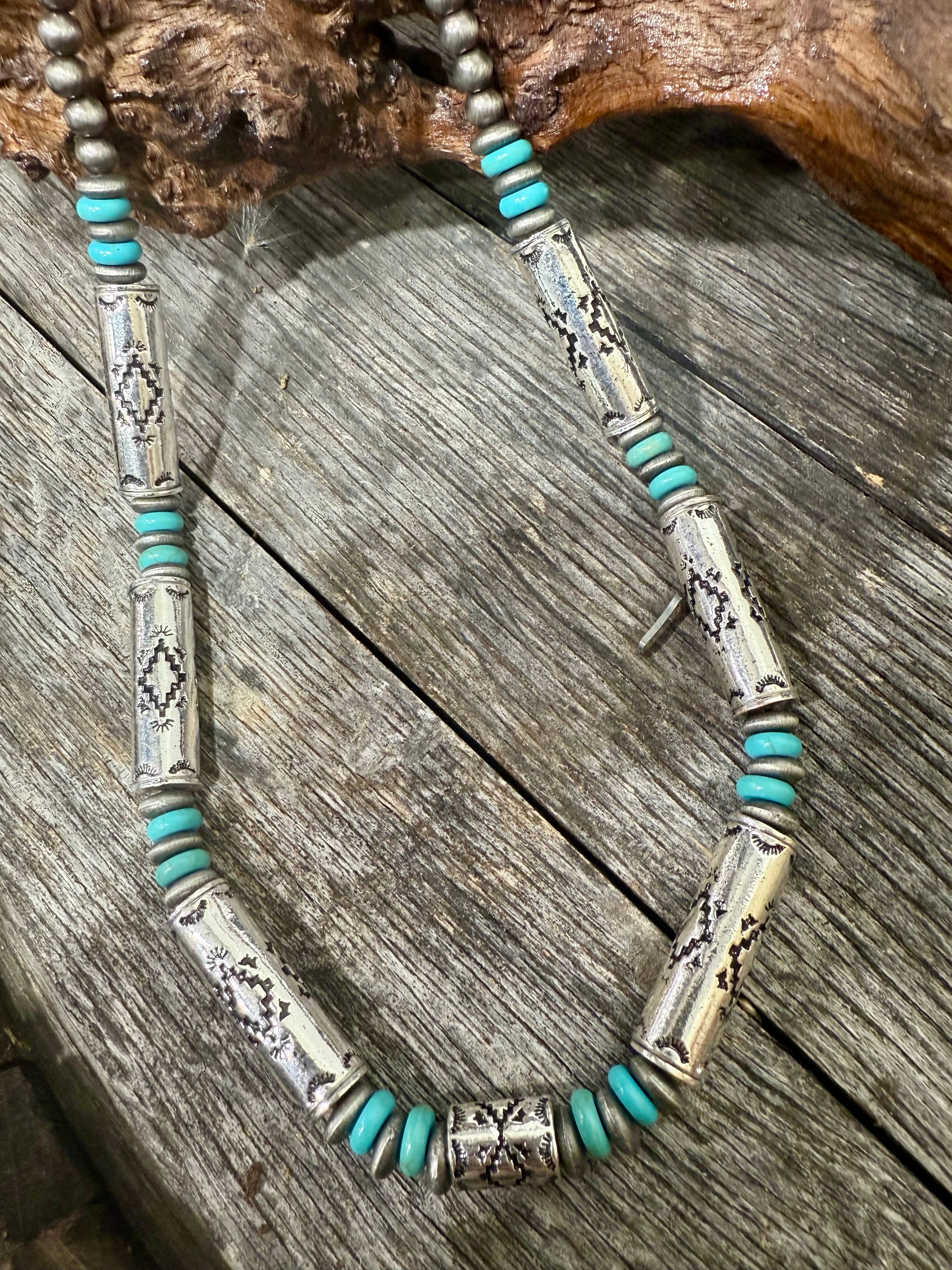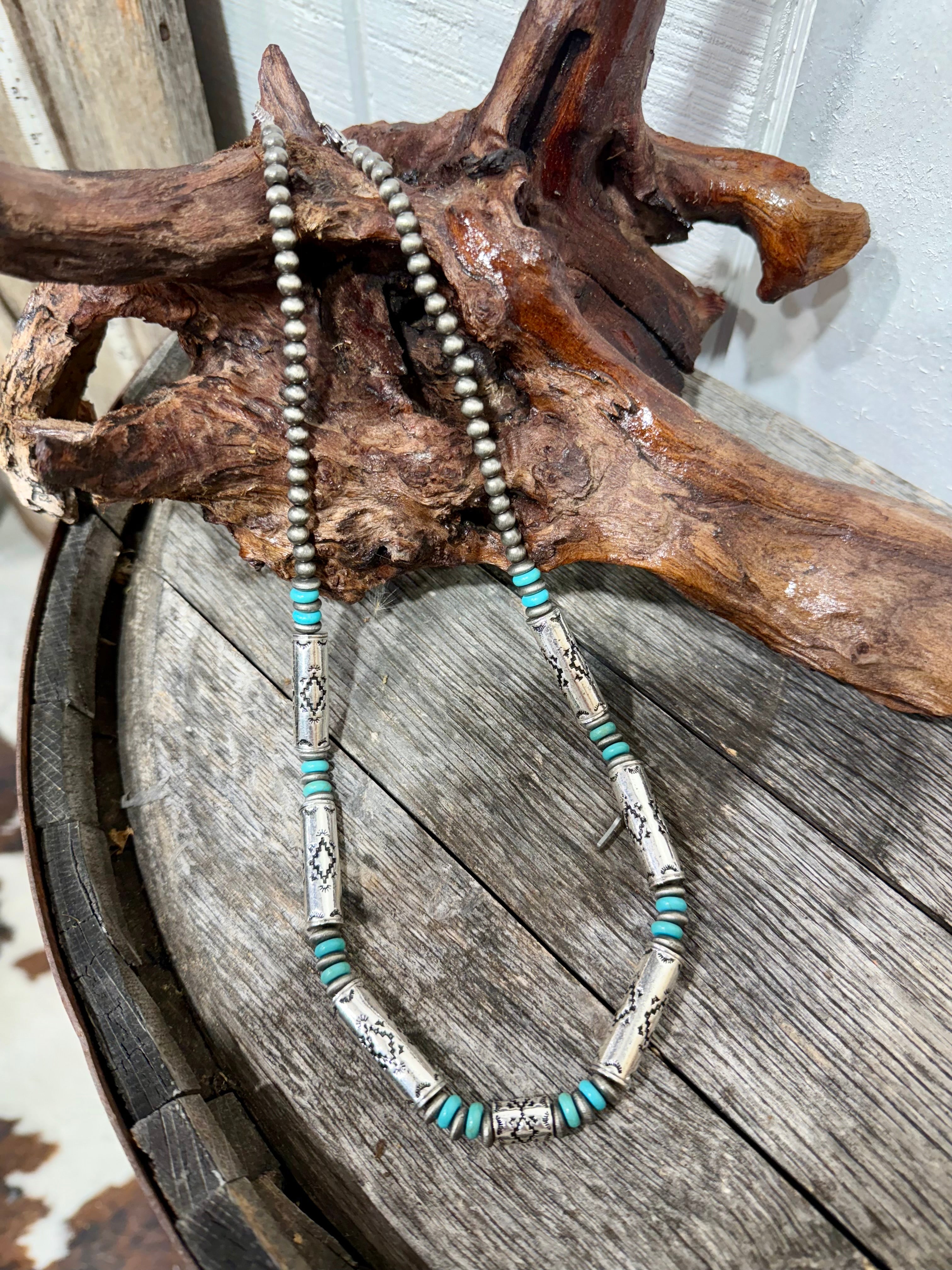 Add a touch of authentic western charm with this stunning stamped silver and turquoise barrel bead necklace. Featuring detailed Navajo-style engravings and vibrant turquoise accents, this piece brings rustic elegance to any outfit. Perfect for pairing with turquoise rings, concho earrings, or your favorite denim jacket for that true cowgirl look.
