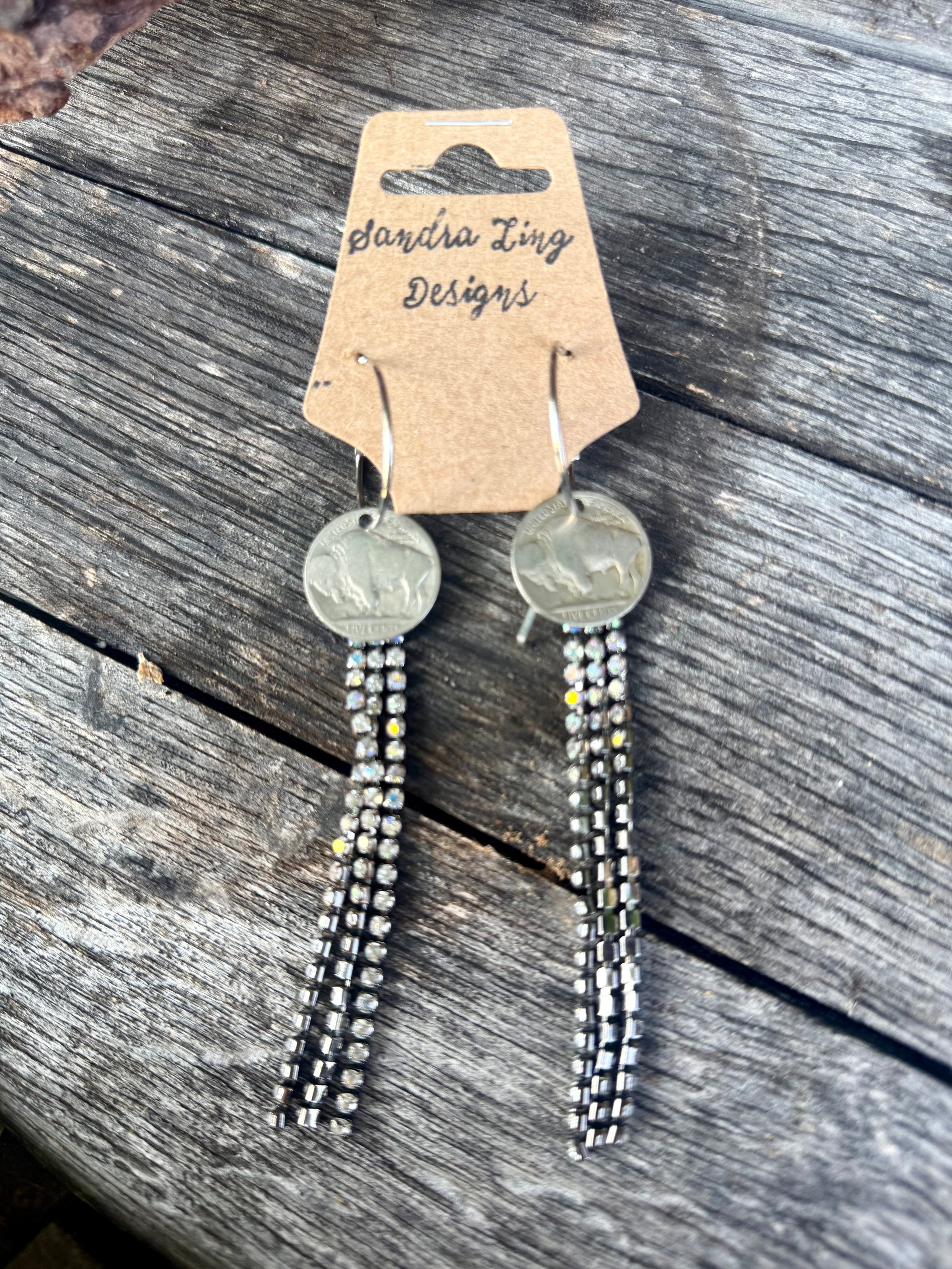 Add western sparkle to your look with these Sandra Ling Designs dangle earrings featuring authentic buffalo nickel coin charms paired with shimmering rhinestone fringe. Lightweight yet eye-catching, these cowgirl earrings blend rustic charm with a touch of glam—perfect for rodeo nights, country concerts, or everyday western style.