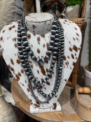 3-Strand Mixed Bead Faux Navajo Pearls Necklace – Layered Western Silver Statement