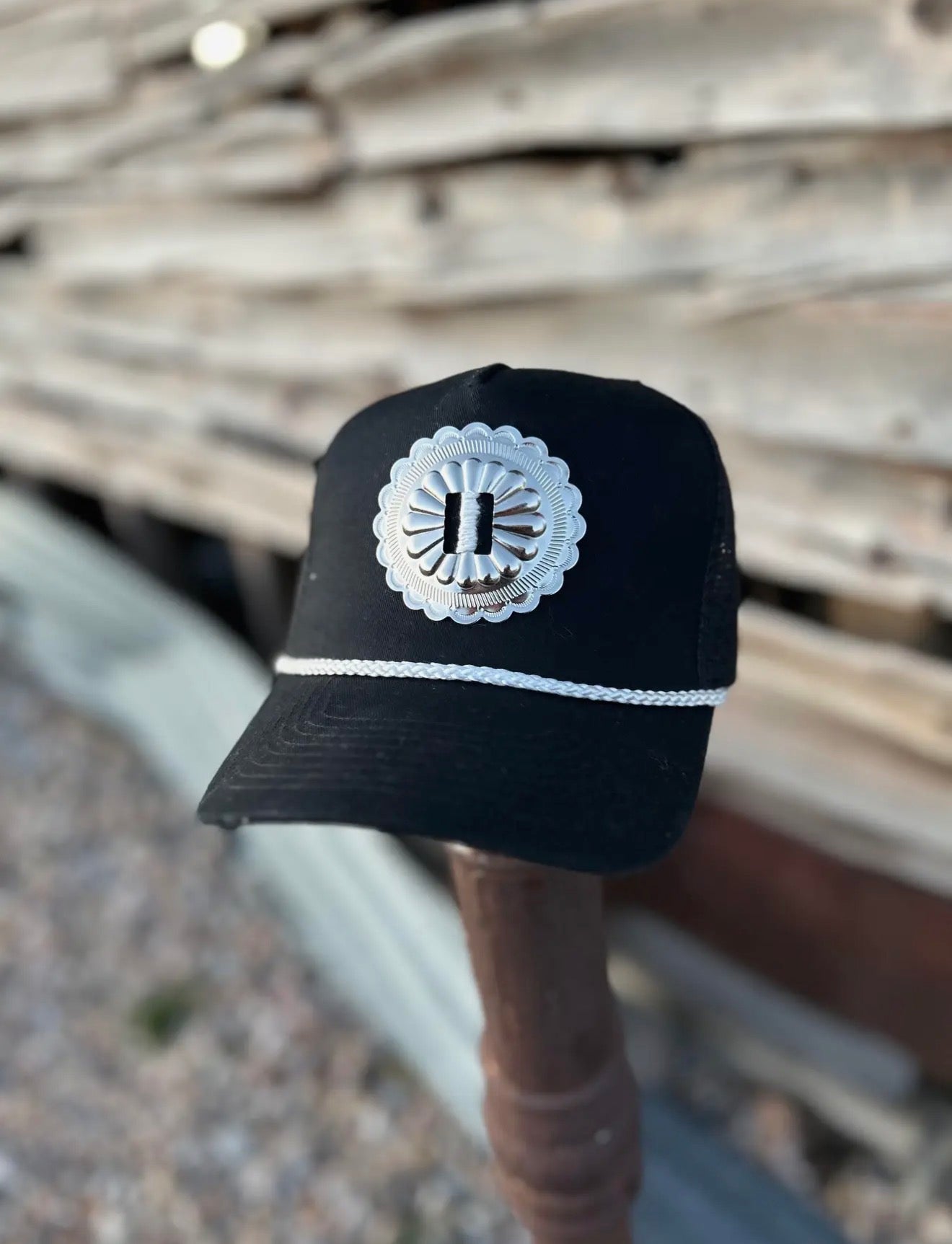 Our Western Concho Trucker Hat features a classic black structured crown with a stunning oversized silver concho centerpiece and rope accent detail across the brim. The breathable mesh back gives it that true cowgirl trucker feel while keeping it lightweight and comfortable for all-day wear.