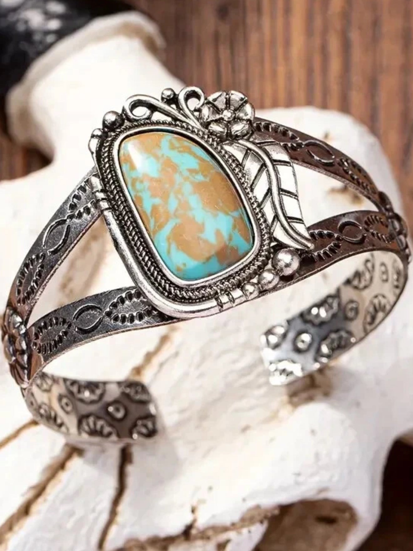 This stunning Tibetan silver cuff bracelet features a natural turquoise stone framed by intricate leaf and floral detailing. With hand-tooled etching and a bold split-band design, it captures the perfect blend of bohemian spirit and western cowgirl charm. Add a touch of earthy elegance to any outfit—ideal for stacking or making a statement