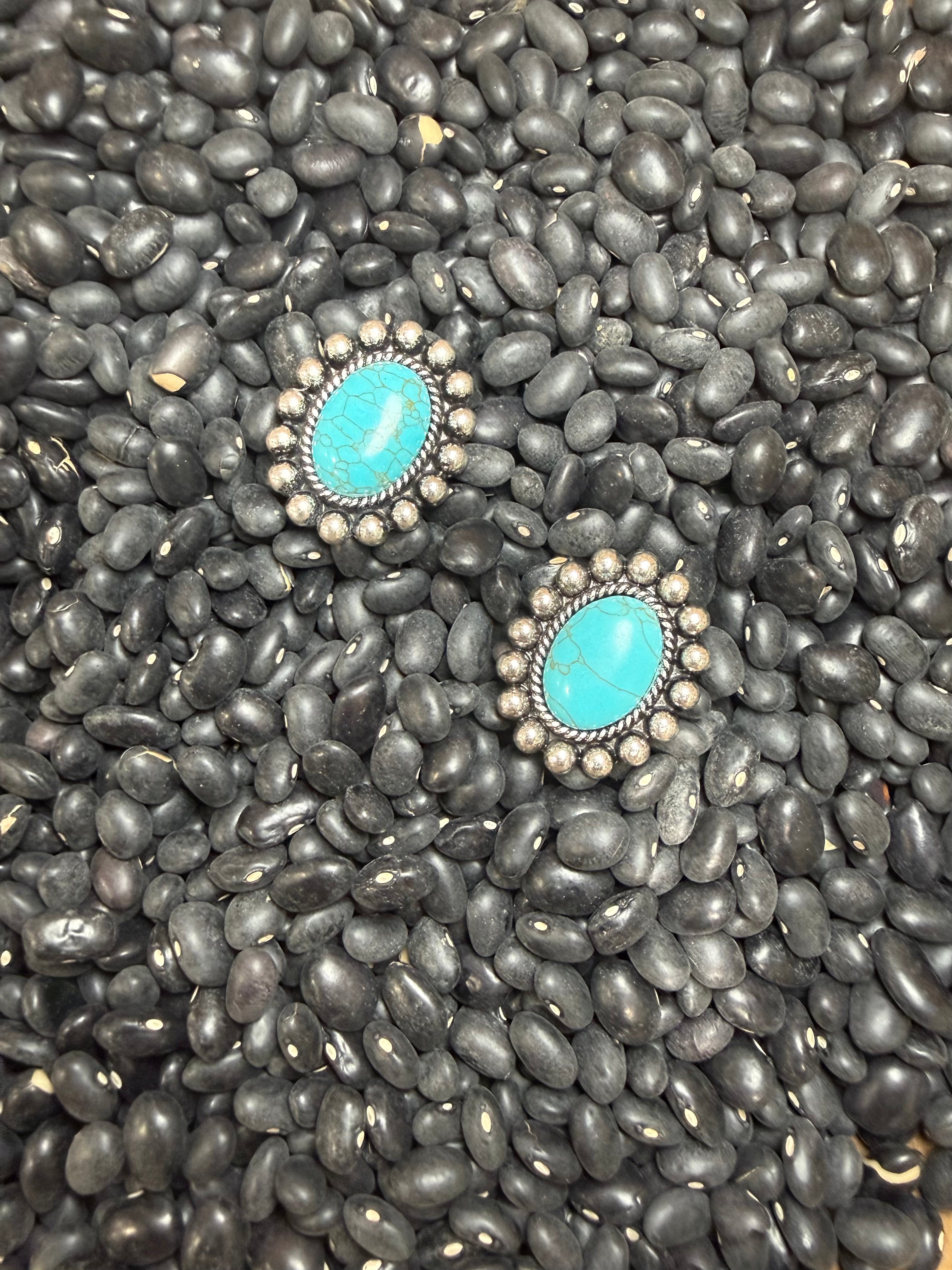 Classic western turquoise oval stud earrings featuring a beaded silver concho frame. Lightweight, timeless, and perfect for everyday wear or layering with your favorite cowgirl jewelry