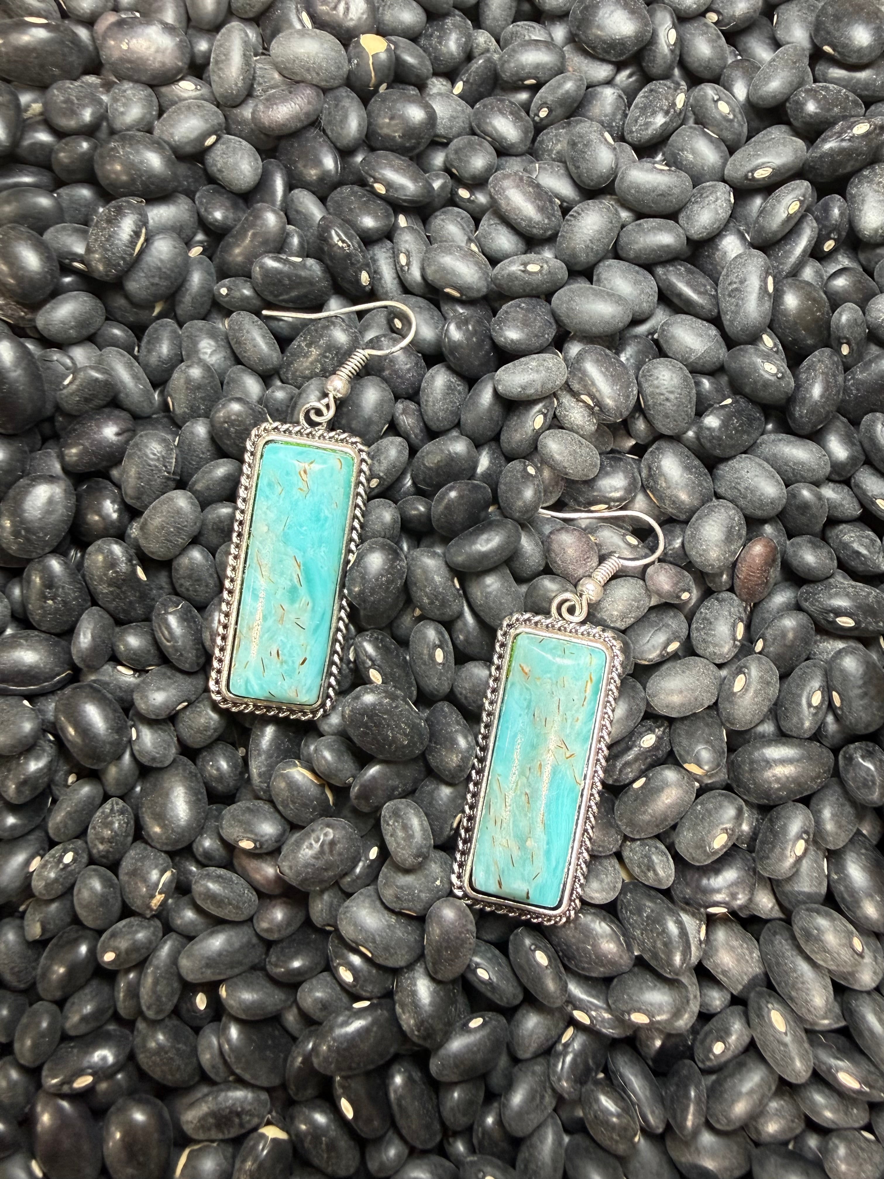 Classic rectangle turquoise drop earrings set in antique-style German silver. Lightweight with natural veining, these western statement earrings add a bold pop of turquoise to everyday outfits or dressed-up cowgirl looks.