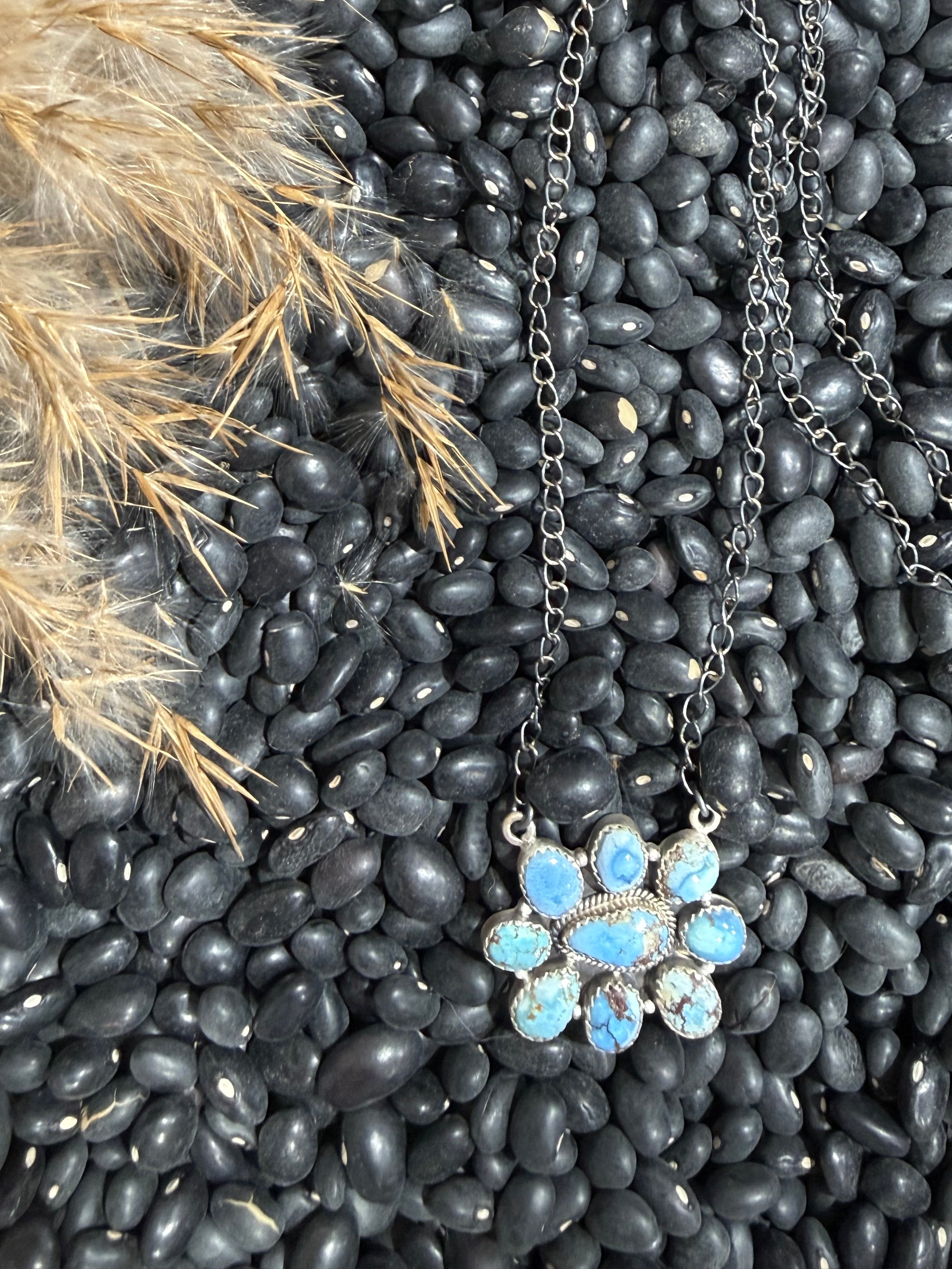 This Golden Hills Turquoise Cluster Necklace showcases genuine Golden Hills turquoise, prized for its soft sky-blue tones and delicate lavender matrix. Hand-set in sterling silver, the floral-inspired cluster design offers timeless southwestern elegance with heirloom appeal. Each stone is naturally unique, making this necklace a true statement piece for collectors and lovers of authentic western turquoise. Perfect worn alone or layered, it brings refined ranch style and classic artisan craftsmanship to any look