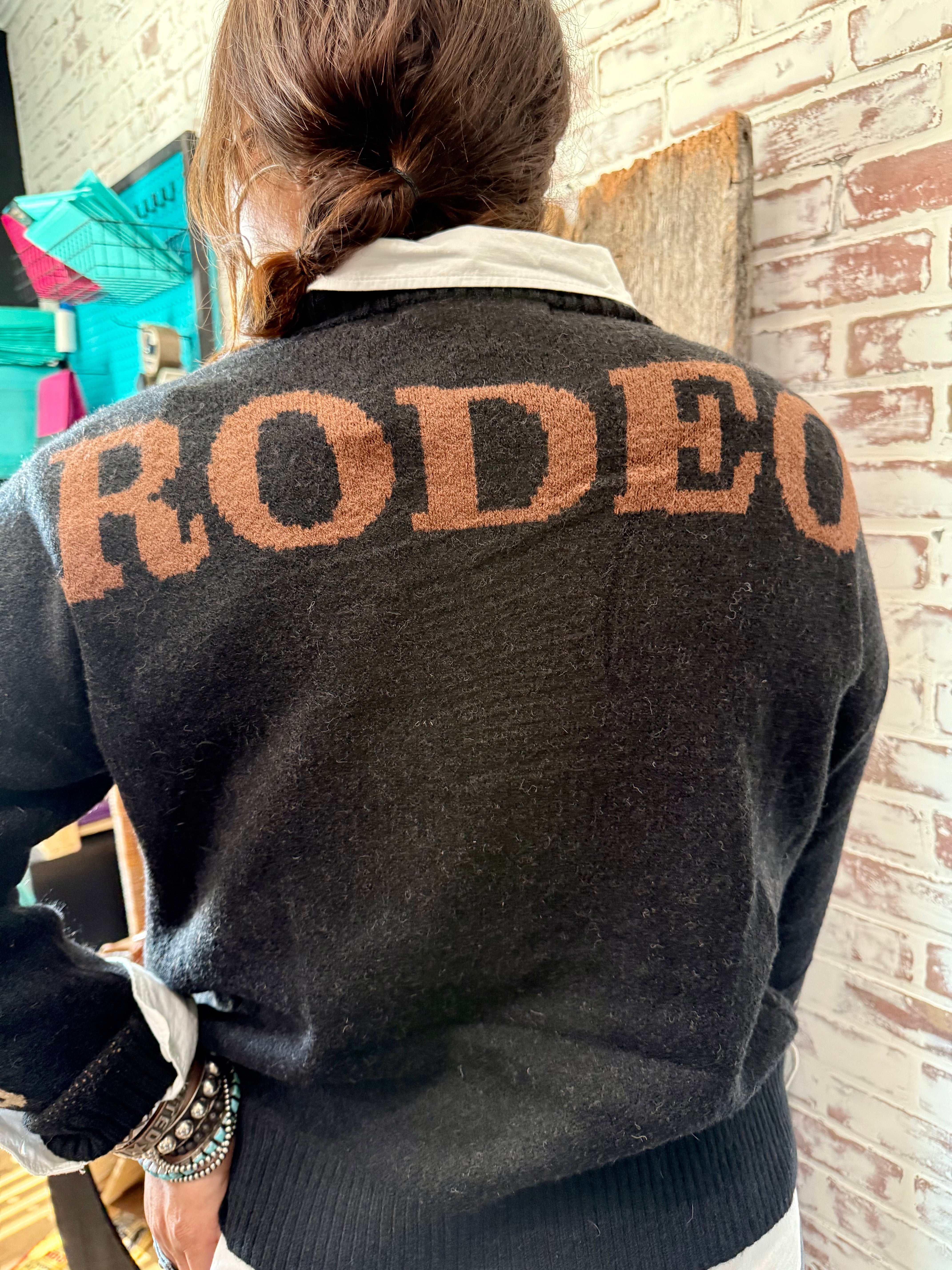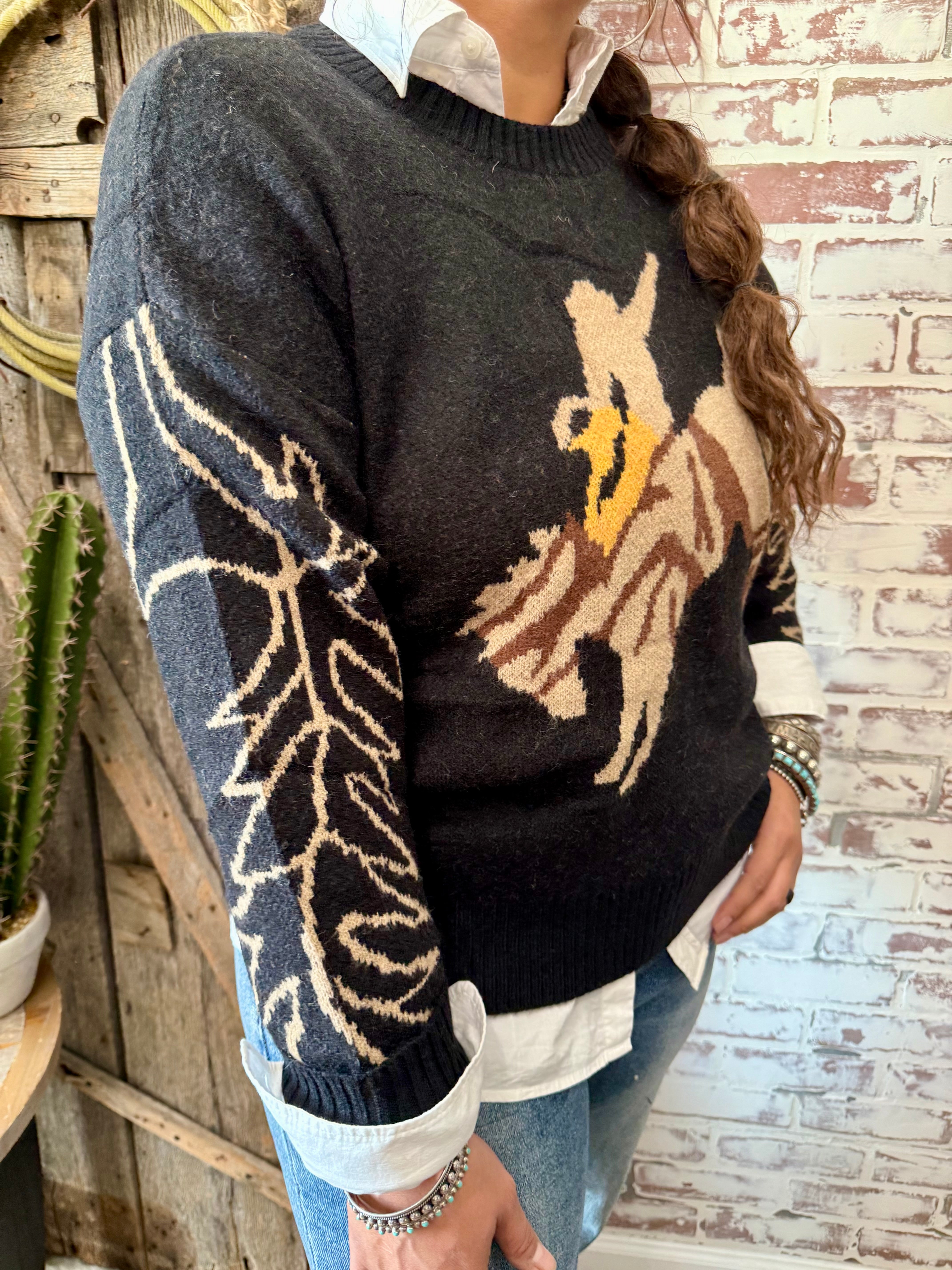 Turn heads in this bold Rodeo Cowboy Sweater, designed for true western spirit. Featuring a striking bronc rider graphic on the front, “RODEO” lettering across the back, and boot-stitch inspired sleeve detail, this cozy pullover is perfect for rodeo nights, western events, or everyday cowgirl style. Pair it with jeans and boots for a punchy rodeo-ready look