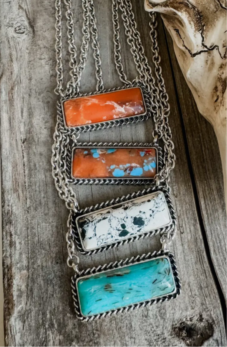 We strive to offer fashion pieces that our budget minded ladies will love. Bold and authentic Southwestern style bar necklaces featuring rectangular stone pendants framed in silver rope detailing. Each unique piece showcases faux stones including vibrant turquoise, fiery spiny oyster, striking white buffalo & orange mosaic .Layered on sturdy chains, these necklaces are perfect statement pieces for our budget minded cowgirls, boho fashion lovers, and collectors of Native-inspired Western jewelry.