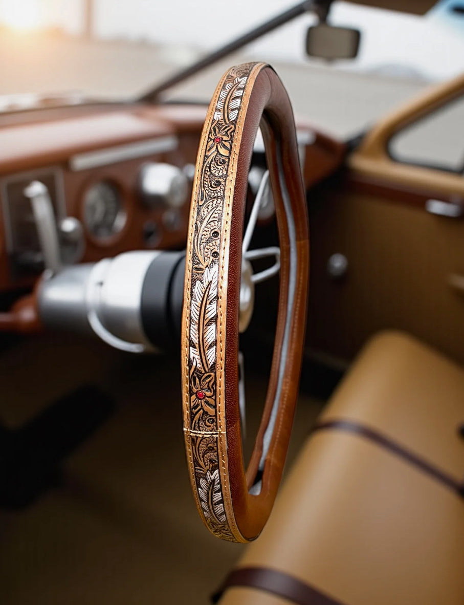 Hit the road in western style with this tooled leather steering wheel cover, featuring hand-tooled floral patterns accented with white feathers .