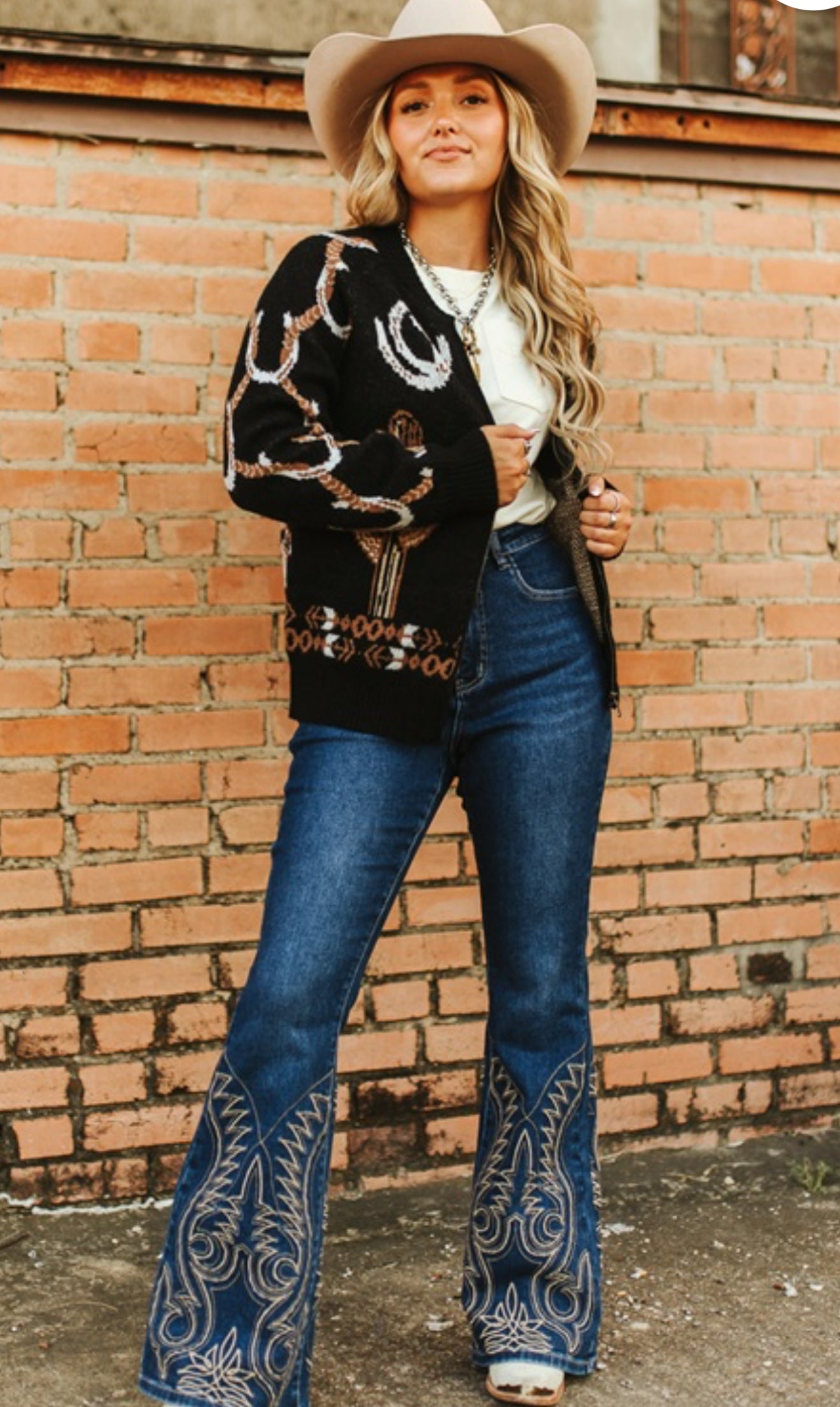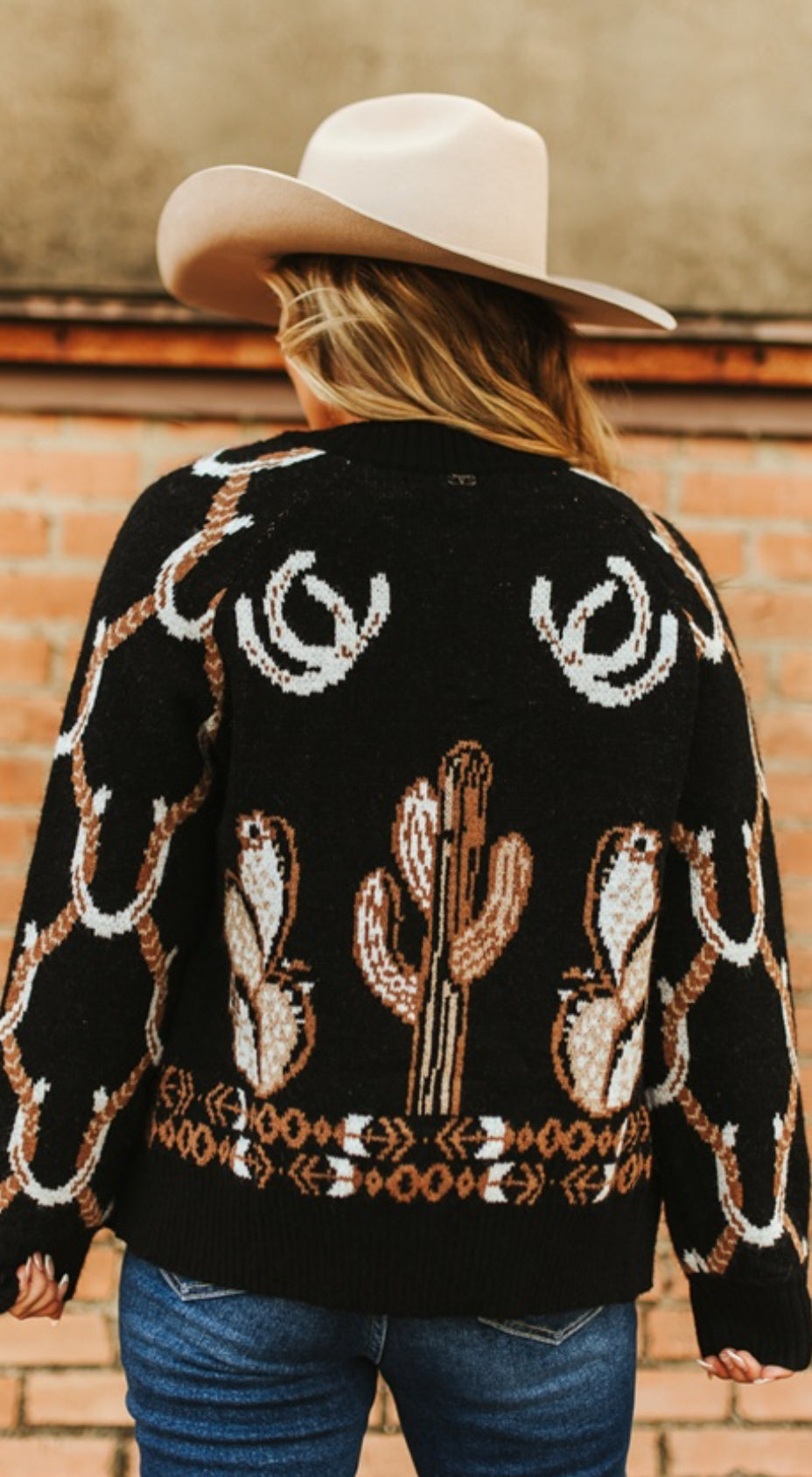 Elevate your Western outerwear collection with this statement black embroidered zip-up sweater, designed for the bold cowgirl with a love for rustic flair. Featuring intricately stitched rodeo rider motifs, roper graphics, and lasso-style patterns in tan and cream thread, this heavyweight knit jacket blends fashion and functionality. The flattering silhouette, full zip closure, and ribbed cuffs make it an ideal layering piece for cooler ranch mornings or nights by the bonfire. Perfect for pairing with denim and boots. Designed for women who live and breathe the Western lifestyle, this knit cardigan jacket brings authentic cowgirl charm to your store’s lineup.