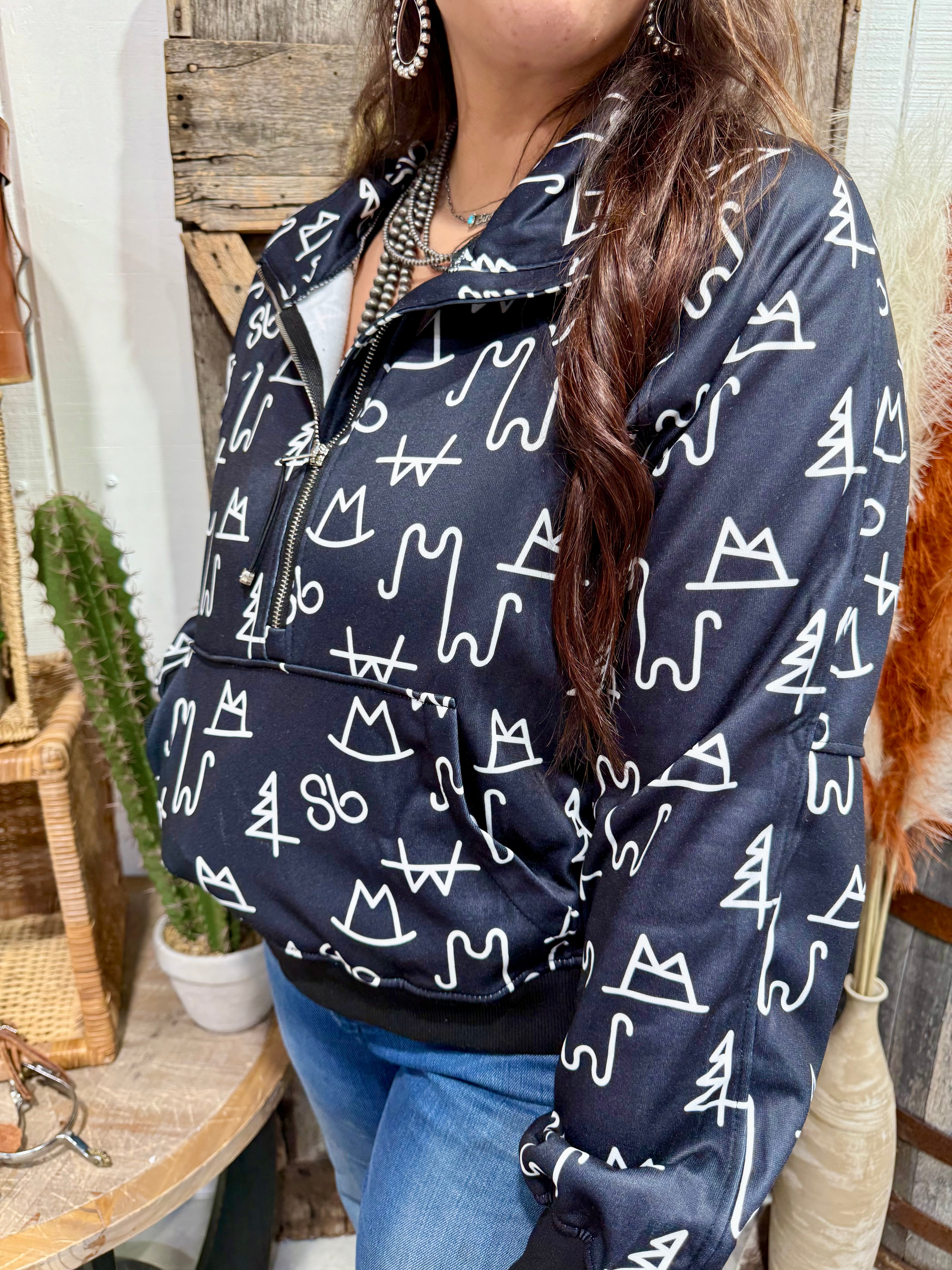 Saddle up in modern ranch style with our Western Brand Symbols Quarter Zip Pullover!
