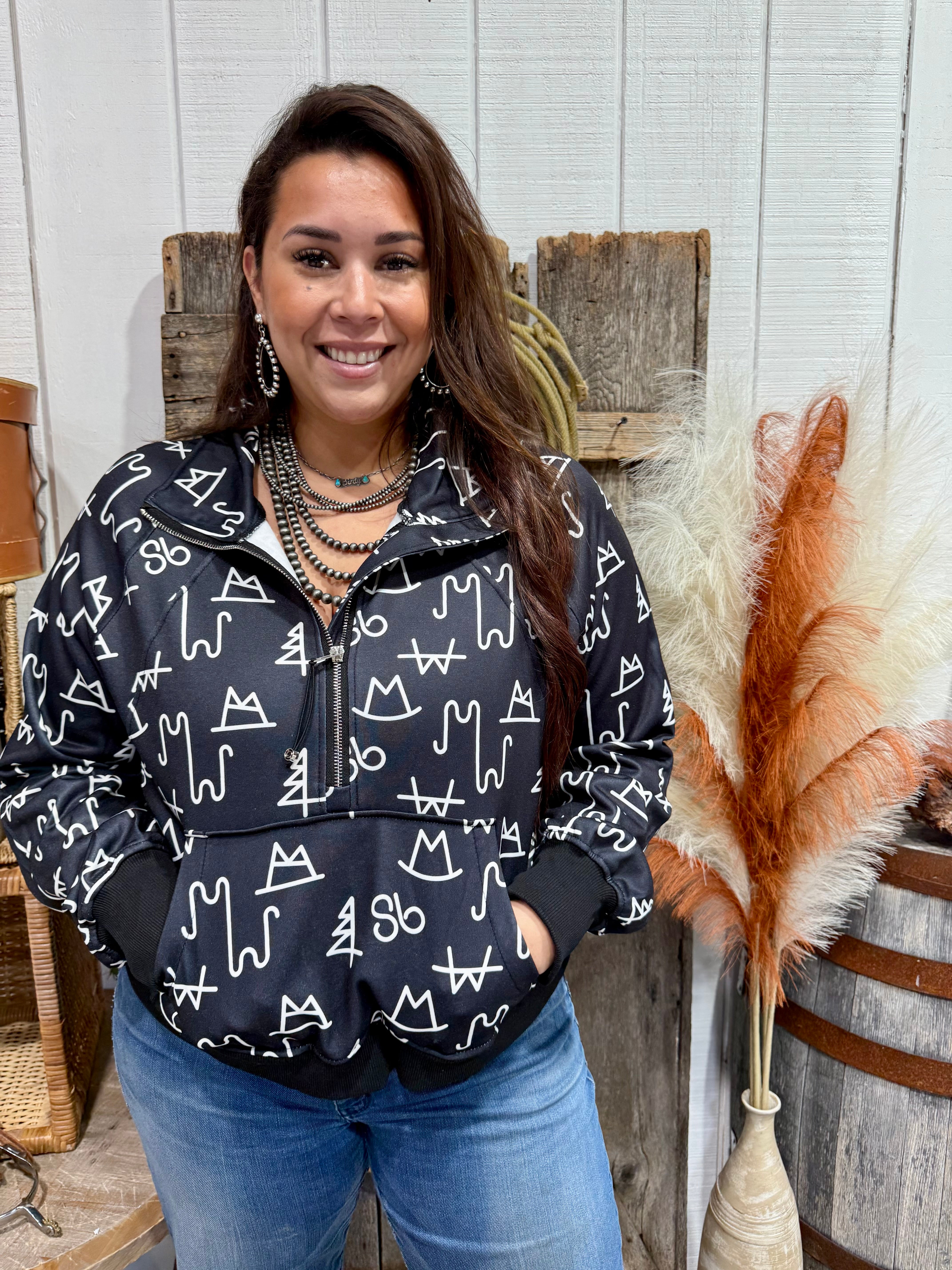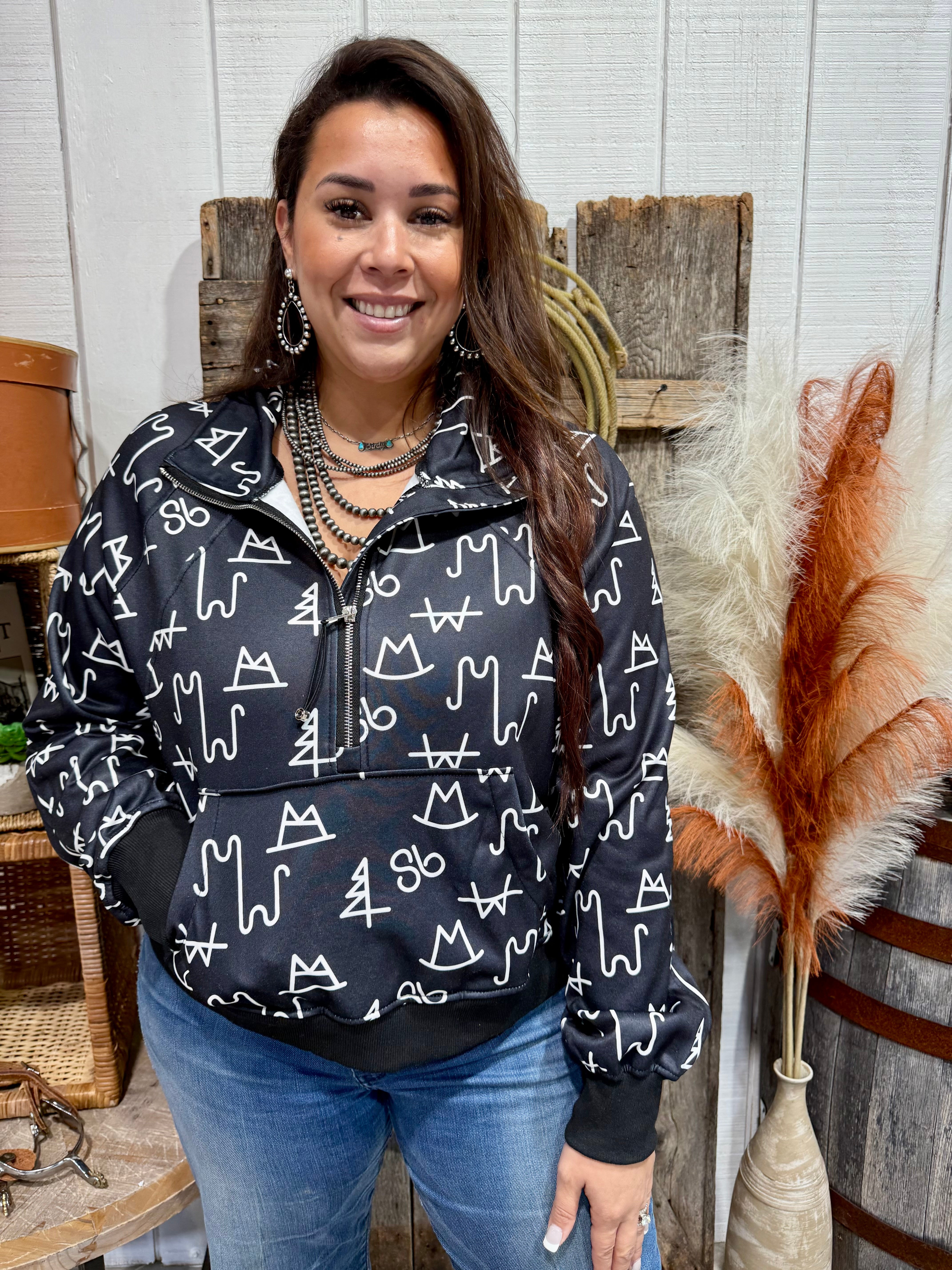 This black half-zip sweatshirt features an eye-catching white western brand print — a mix of cattle brands, cowboy hat, rope, and tree motifs for that true cowgirl aesthetic. Made with soft, mid-weight fabric, it’s cozy yet breathable for layering through every season. The quarter-zip neckline, kangaroo pocket, and banded cuffs keep it casual and functional for ranch days, rodeo weekends, or cozy coffee runs.