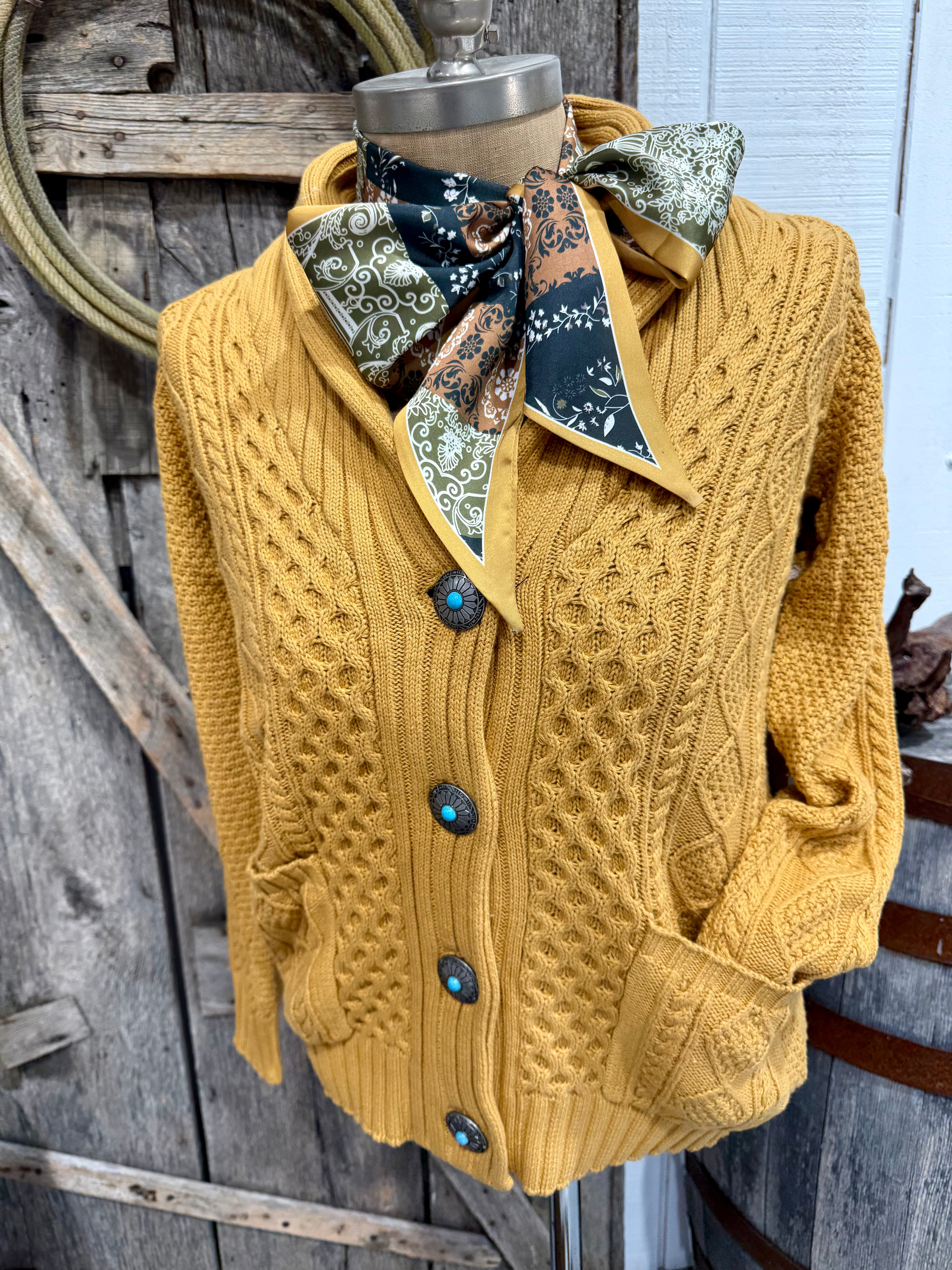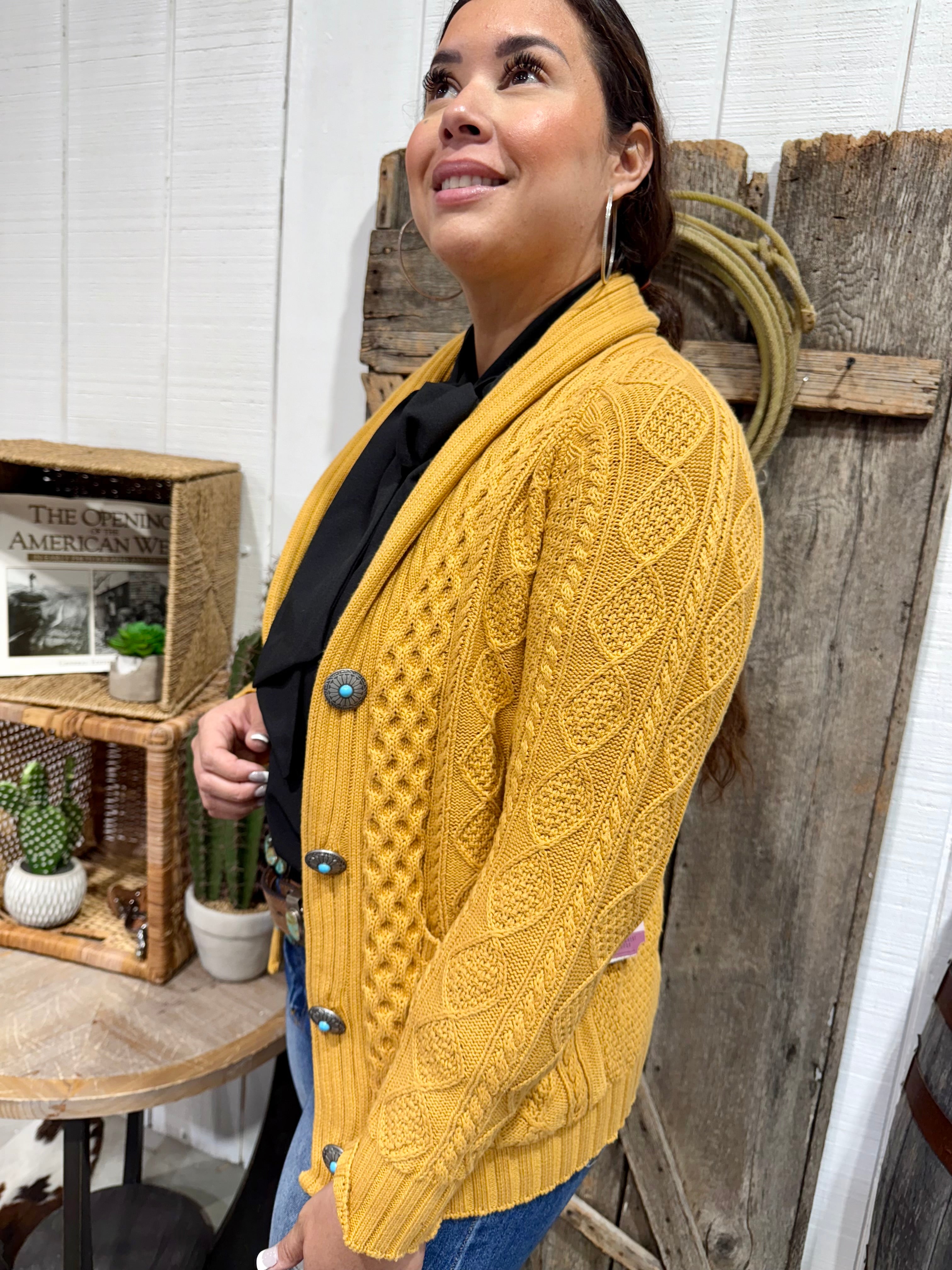 Add a touch of western charm to your fall wardrobe with our Golden Mesa Concho Cardigan. This cozy mustard yellow cable knit sweater features intricate western-inspired patterns, front pockets, and bold antique silver concho buttons with turquoise centers for that perfect cowgirl flair. The soft, midweight knit and relaxed fit make it ideal for layering over your favorite graphic tee or wild rag. A must-have statement piece for rodeo nights, fall markets, and everyday ranch style.