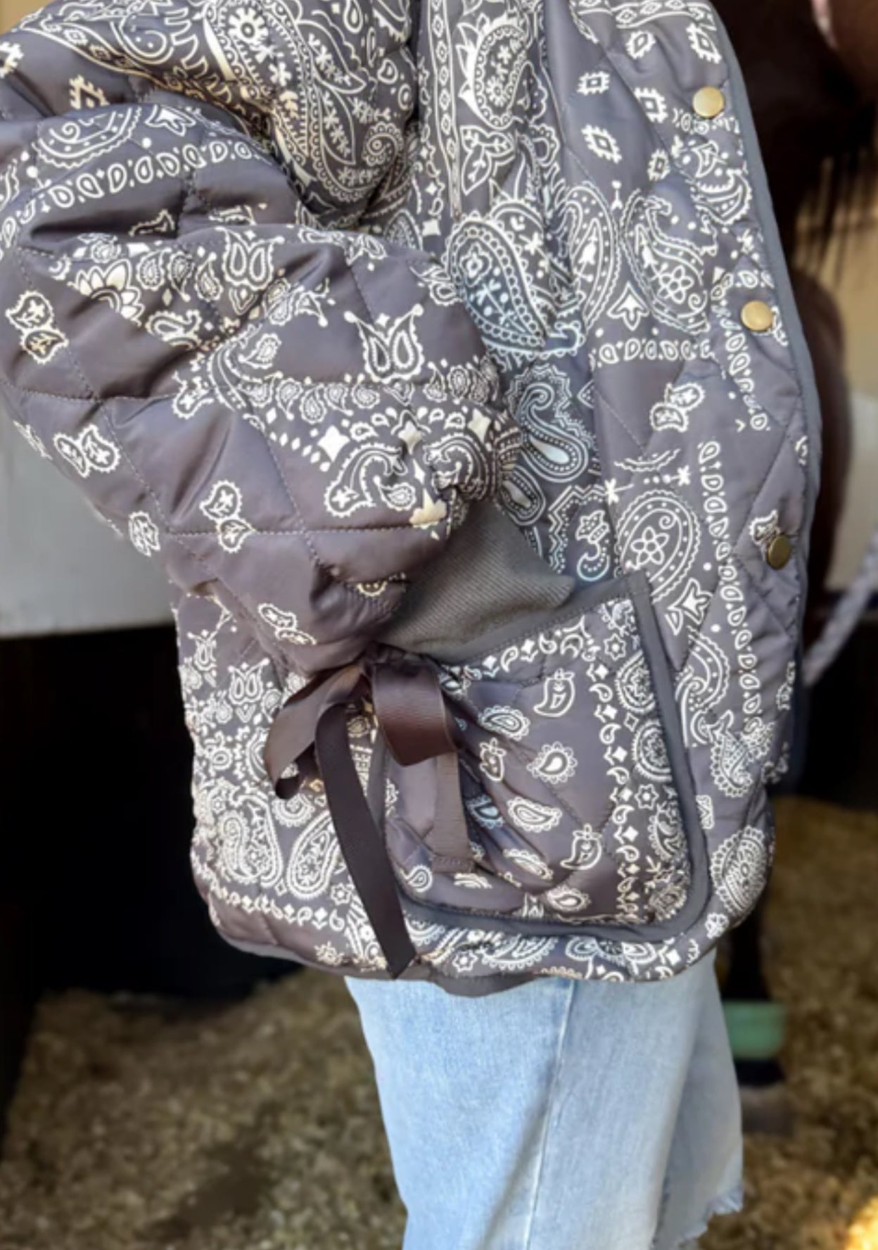 Saddle up in style with this Charcoal Bandana Quilted Western Jacket, the perfect cold-weather layer for any true cowgirl. This cozy quilted coat features an allover bandana print in rich charcoal tones, giving it that rugged-meets-refined western look you can wear from the barn to town.