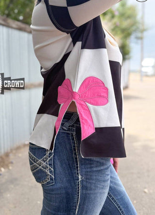 Black & White Checkered Pink Bow Bombshell Pullover – Western Cowgirl Sweatshirt