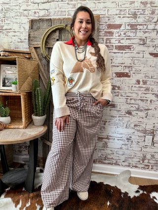 Brown Knit Horse Cardigan with V-Neck & Button Front – Western Style Sweater