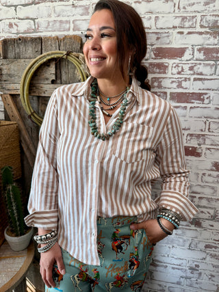 Retro Rodeo Cowboy Print Western Blouse with Striped Sleeves – Cowgirl Style Top