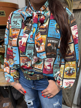 Spirit of the Cowboy Western Collage Print Blouse with Lace Peter Pan Collar