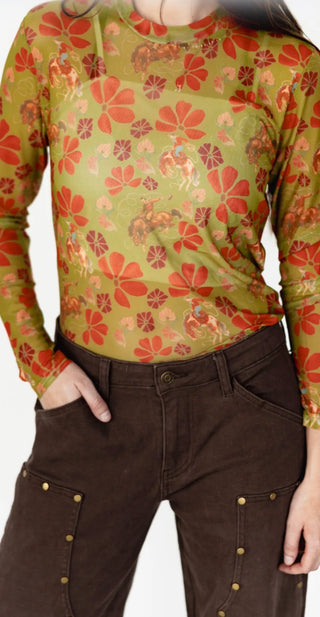 Prairie Bloom Olive Mesh Top | Floral Cowboy Print Long Sleeve Western Top