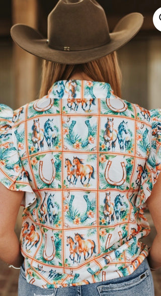 Wild Horses Patchwork Western Blouse – Ruffle Sleeve Cowgirl Top-Plus Size Too!