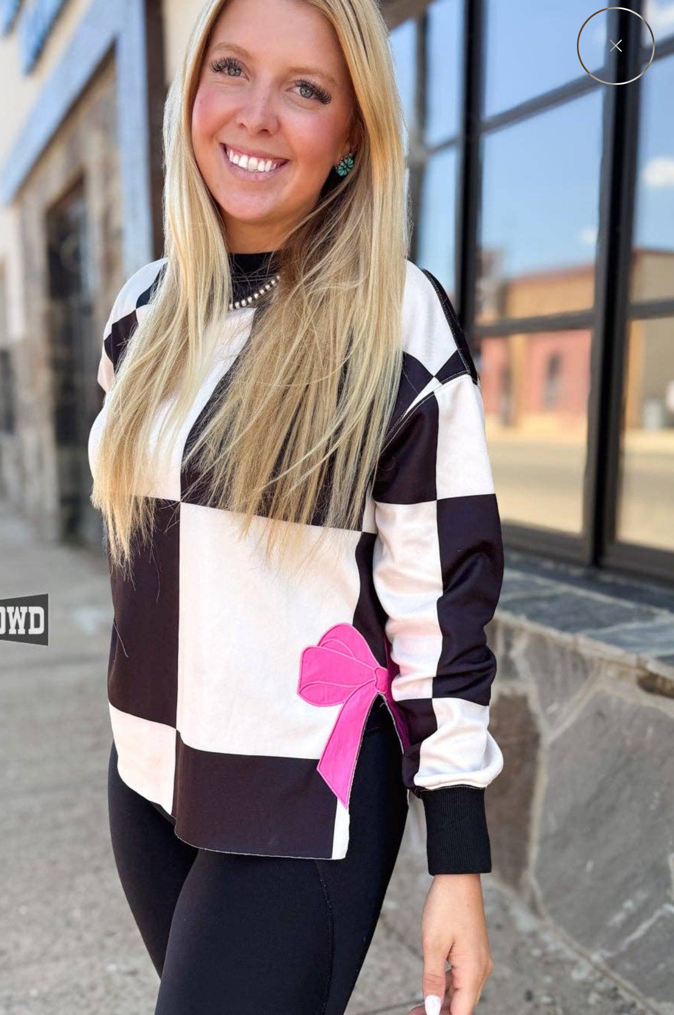 heads with this bold Checkered Pink Bow Pullover, blending playful charm with a touch of western edge. Featuring an oversized black and white checkered pattern and a statement hot pink bow accent on each side, this cozy top adds the perfect pop of color to your cowgirl style. Crafted from soft, lightweight fabric with ribbed cuffs, it’s perfect for layering on cool days or pairing with your favorite denim for a casual, confident look.