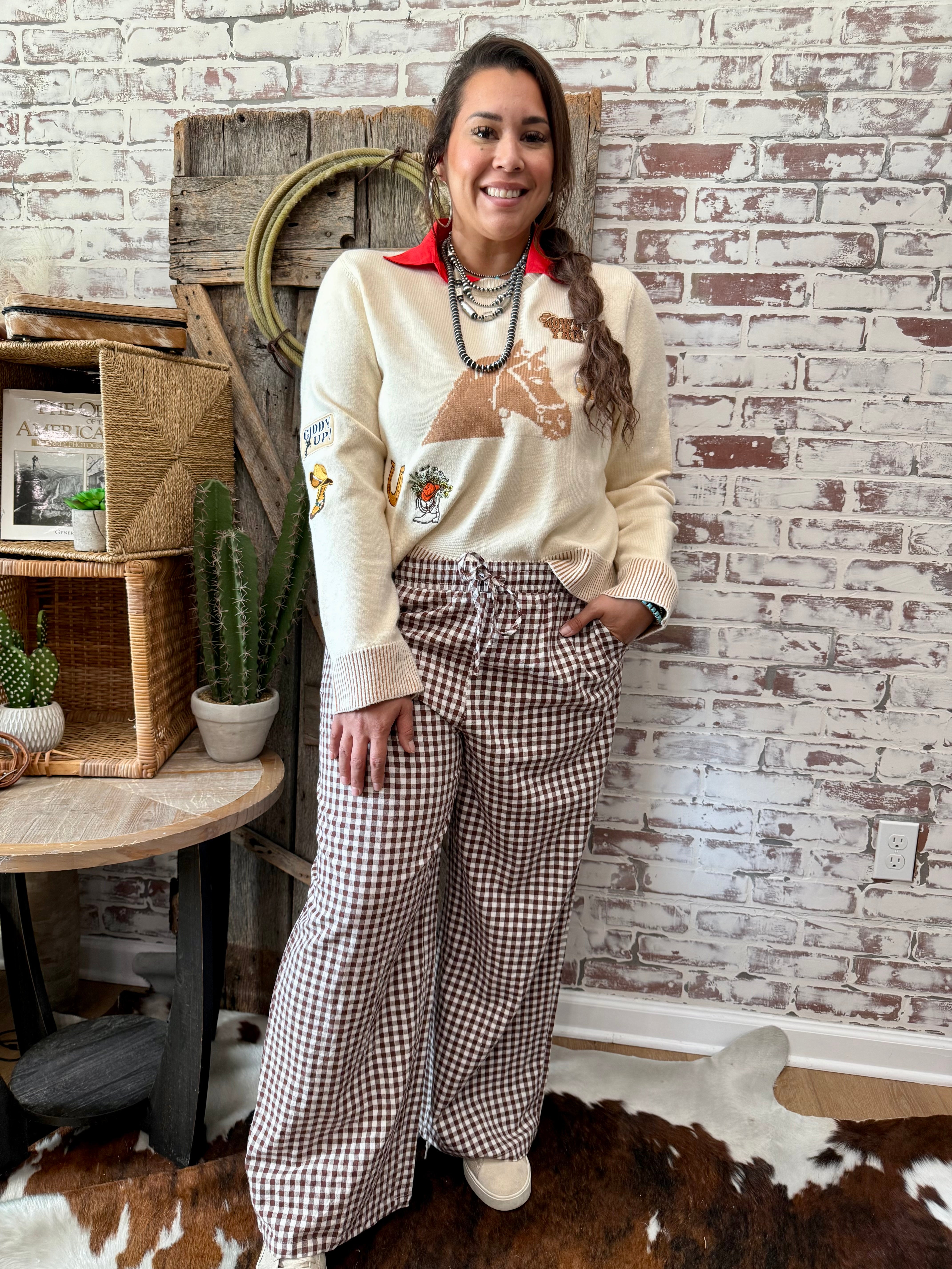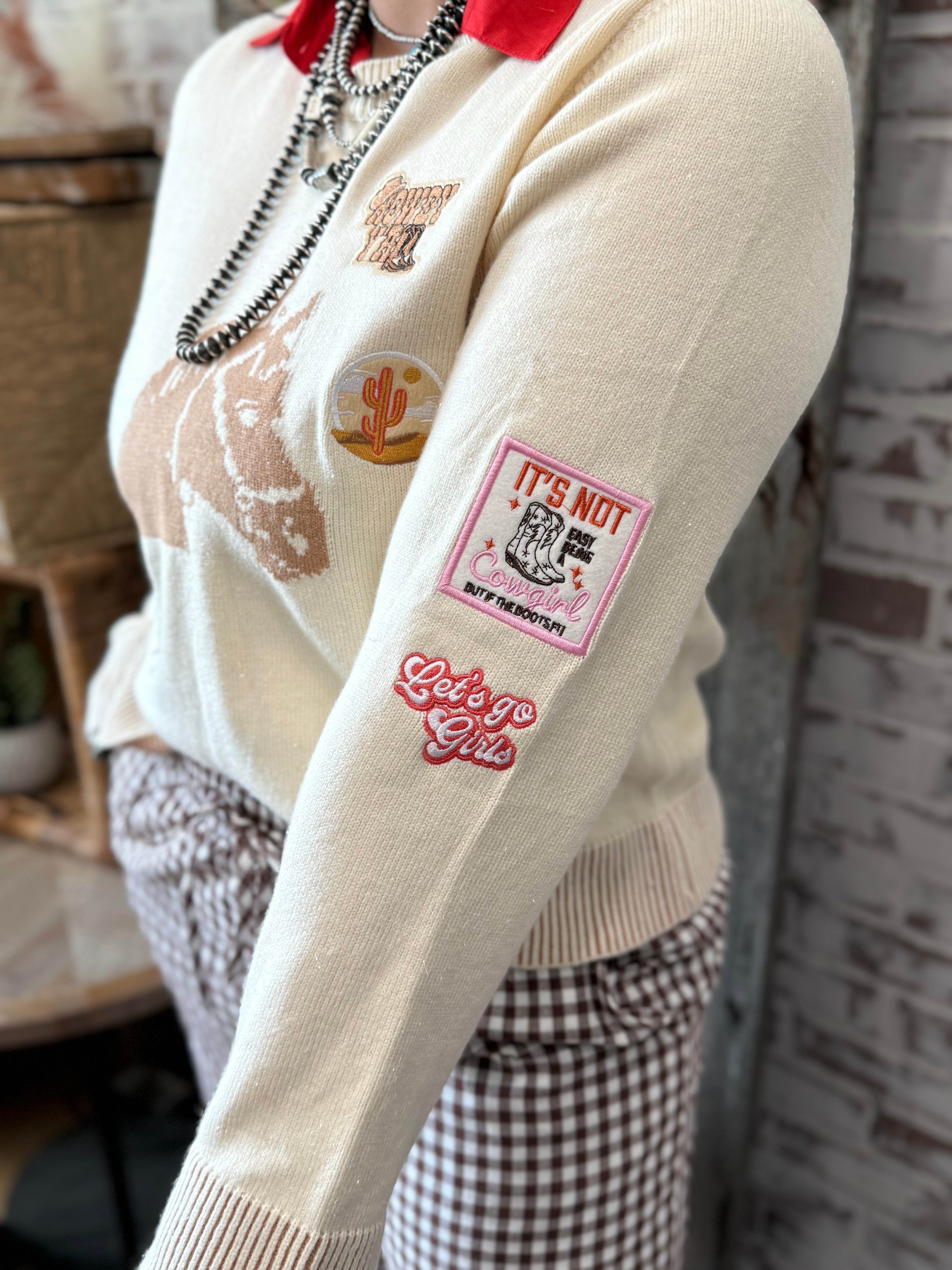 Cozy up in this cream knit cowgirl sweater featuring patches of a horse graphic, horseshoe, boots & rodeo motifs. A perfect western chic layering piece for fall.