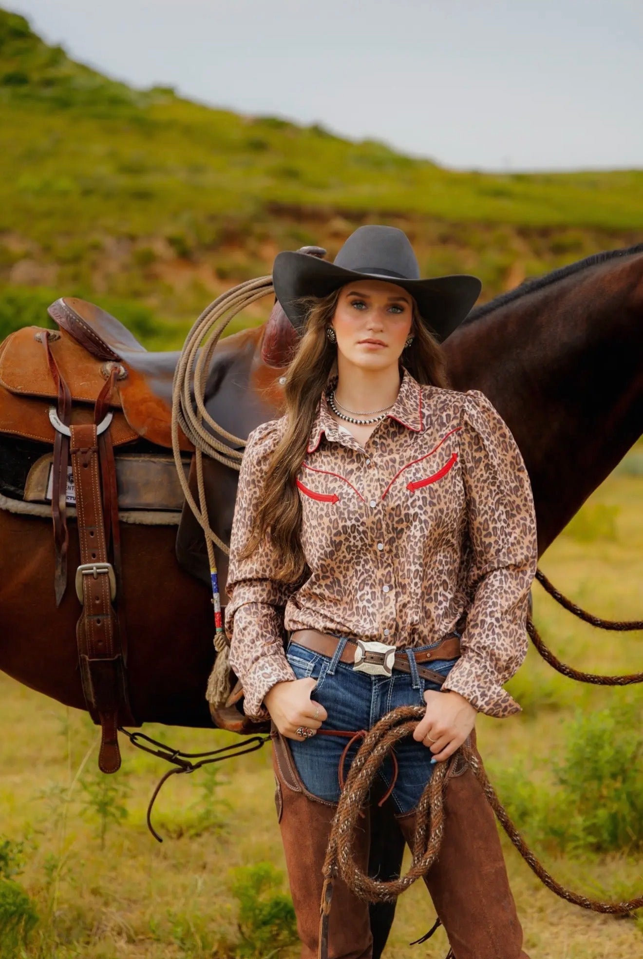 Turn heads in true cowgirl fashion with this Howdy Hanny leopard western snap shirt. Designed with classic western yoke styling, bold red contrast piping, and a flattering tailored fit, this statement piece blends rodeo tradition with modern edge. The lightweight fabric makes it perfect for year-round wear—whether you’re working cattle, heading to a stock show, or styling it up for a night out.