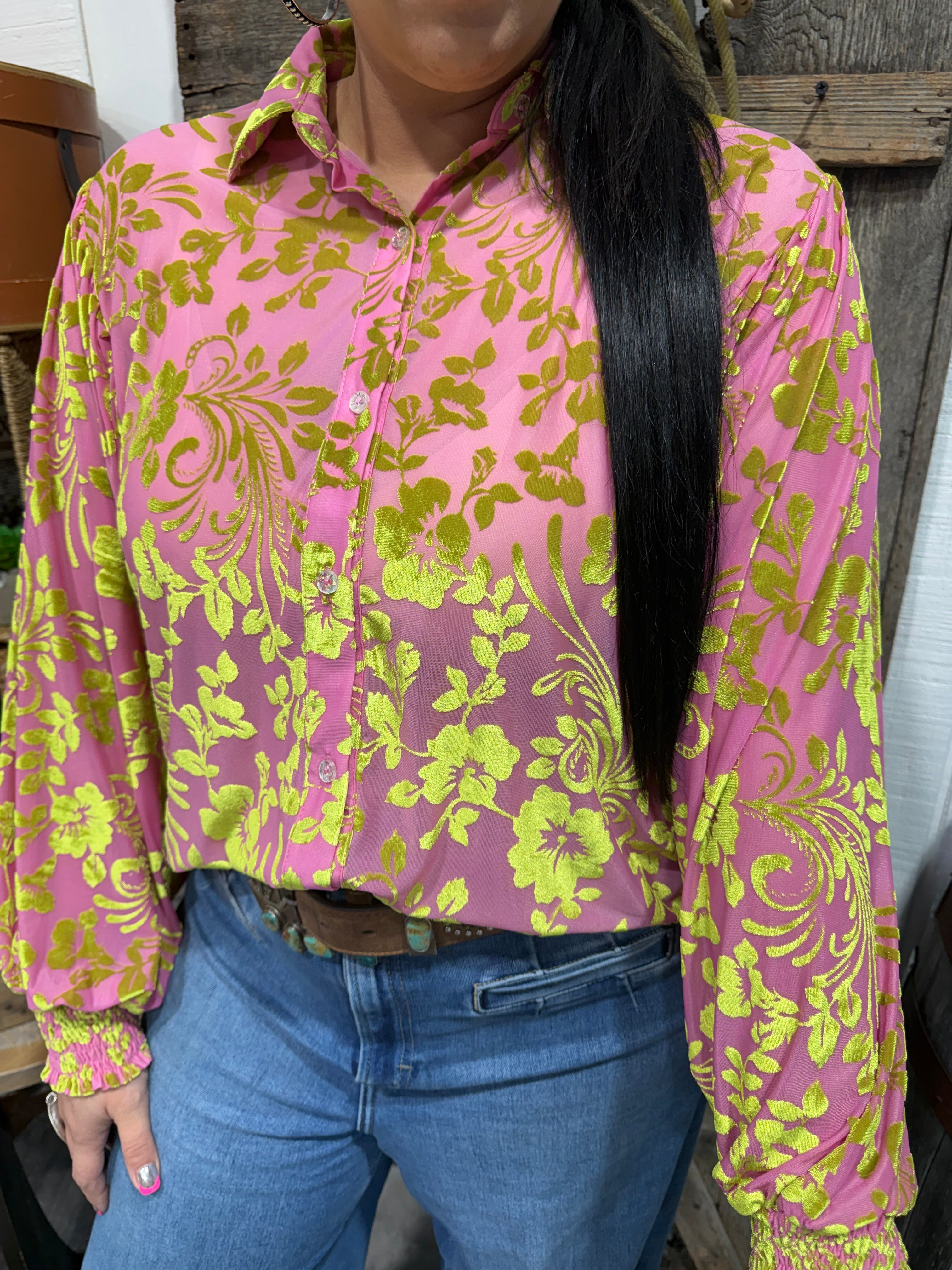 Turn heads in this stunning pink/lime Velvet Jacquard Floral Blouse, the perfect mix of western elegance and rich, dressy texture. This top features a velvety burnout floral design in warm mocha and chocolate tones that catch the light beautifully. With its soft drape, button-down front, and billowy sleeves with smocked cuffs, it moves effortlessly from rodeo date nights to holiday gatherings to work-to-weekend wear.