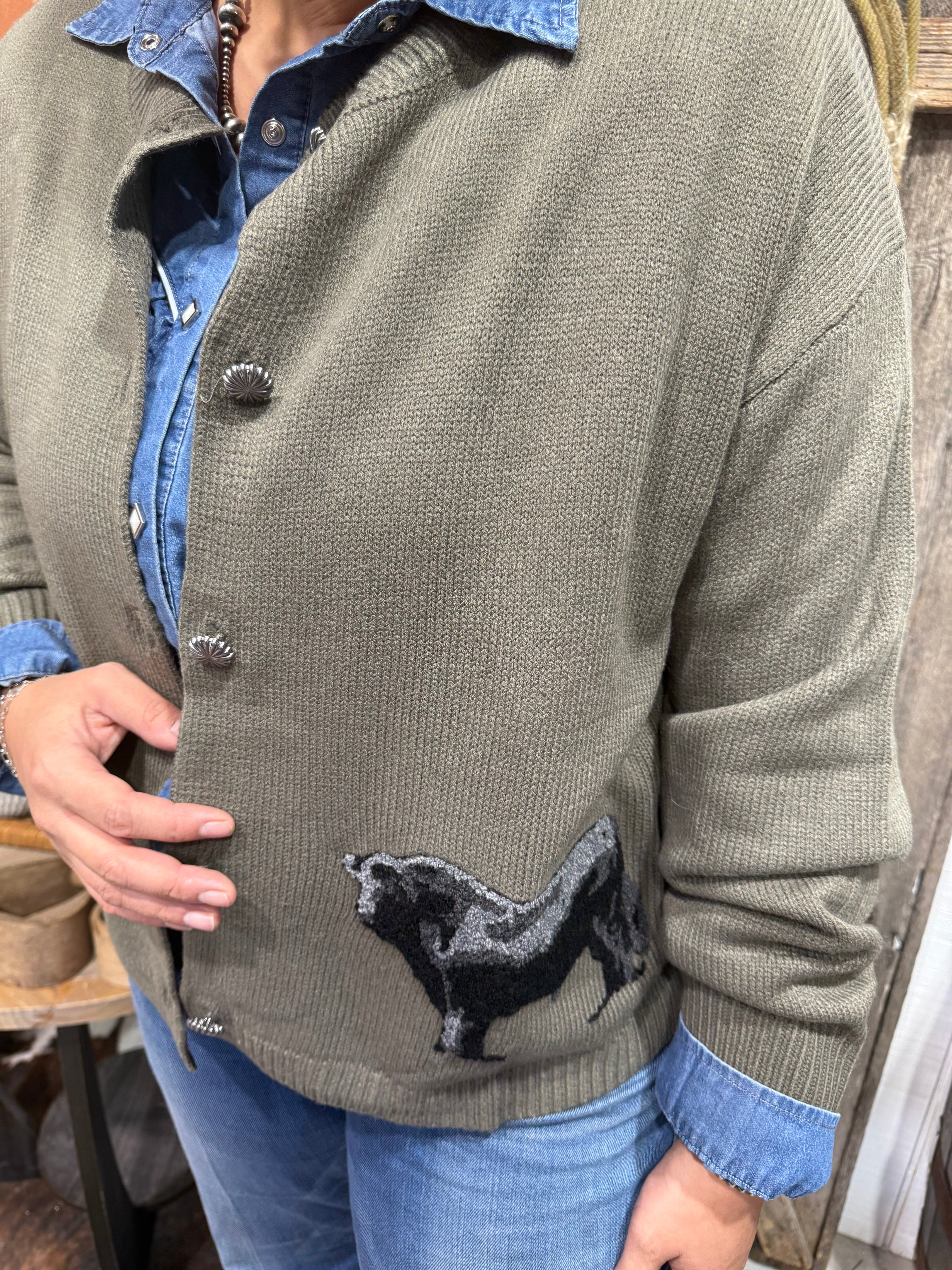 Channel true ranch-born confidence with the Ranch Royalty Sweater — a taupe button-up cardigan featuring bold woven bull graphics that bring authentic western grit to a soft, cozy silhouette. This premium knit layer pairs effortlessly with denim, turquoise, and boots, making it a year-round go-to for cowgirls who love a little statement in their staples.