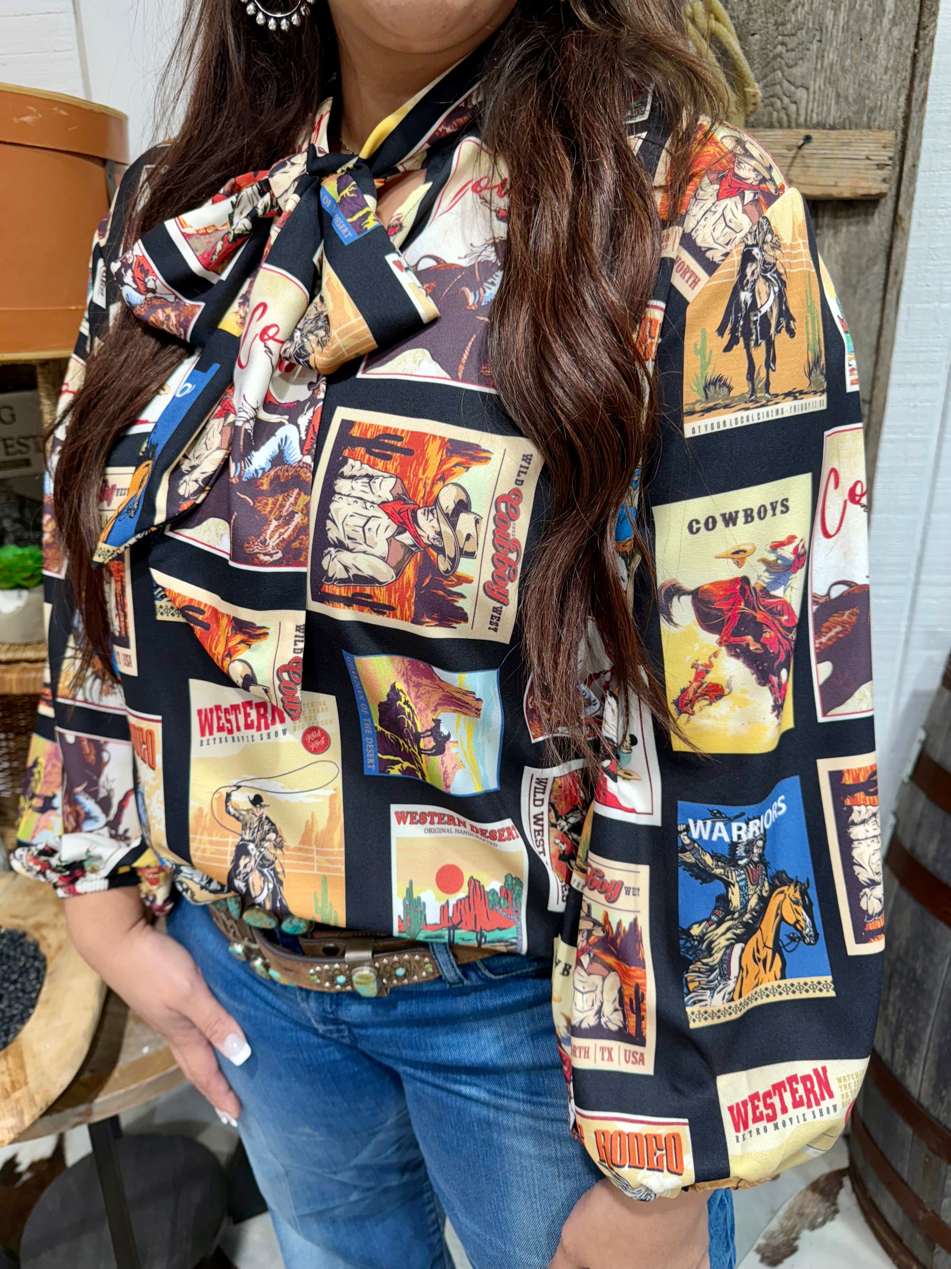 Saddle up in standout style with our Retro Western Rodeo Collage Tie-Neck Blouse — a bold, vintage-inspired top covered in old-school cowboy posters, rodeo graphics, and western desert scenes. This blouse brings classic cowgirl flair with a polished twist, featuring a soft woven fabric, elegant tie-neck detail, and billowy long sleeves with comfortable elastic cuffs.