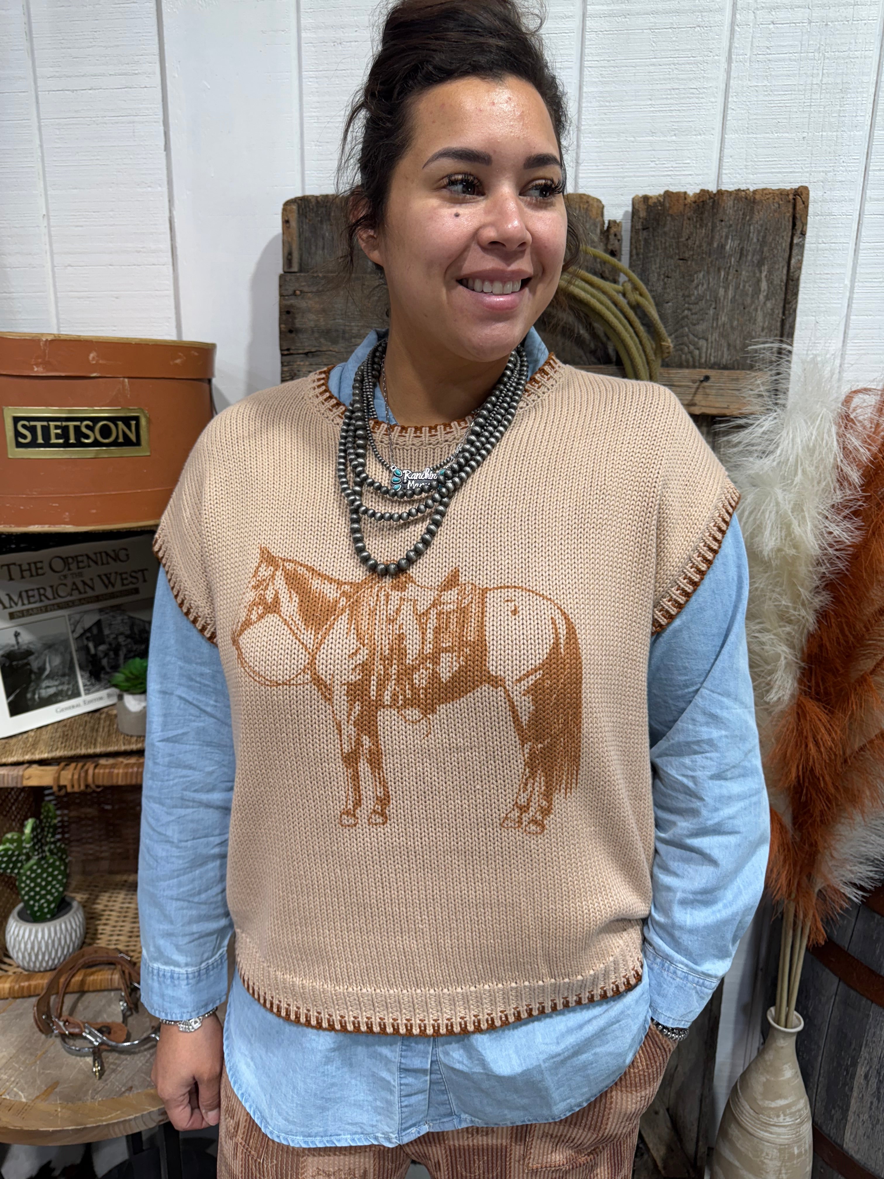 Saddle up in cozy western style with the Cowpony Sweater Vest, a soft knit layer featuring a vintage saddle-horse sketch across the front. This neutral tan vest is perfect for year-round cowgirl styling — lightweight enough to layer over chambray tops, denim shirts, or long sleeves, yet warm and textured for a classic ranch-ready look.
