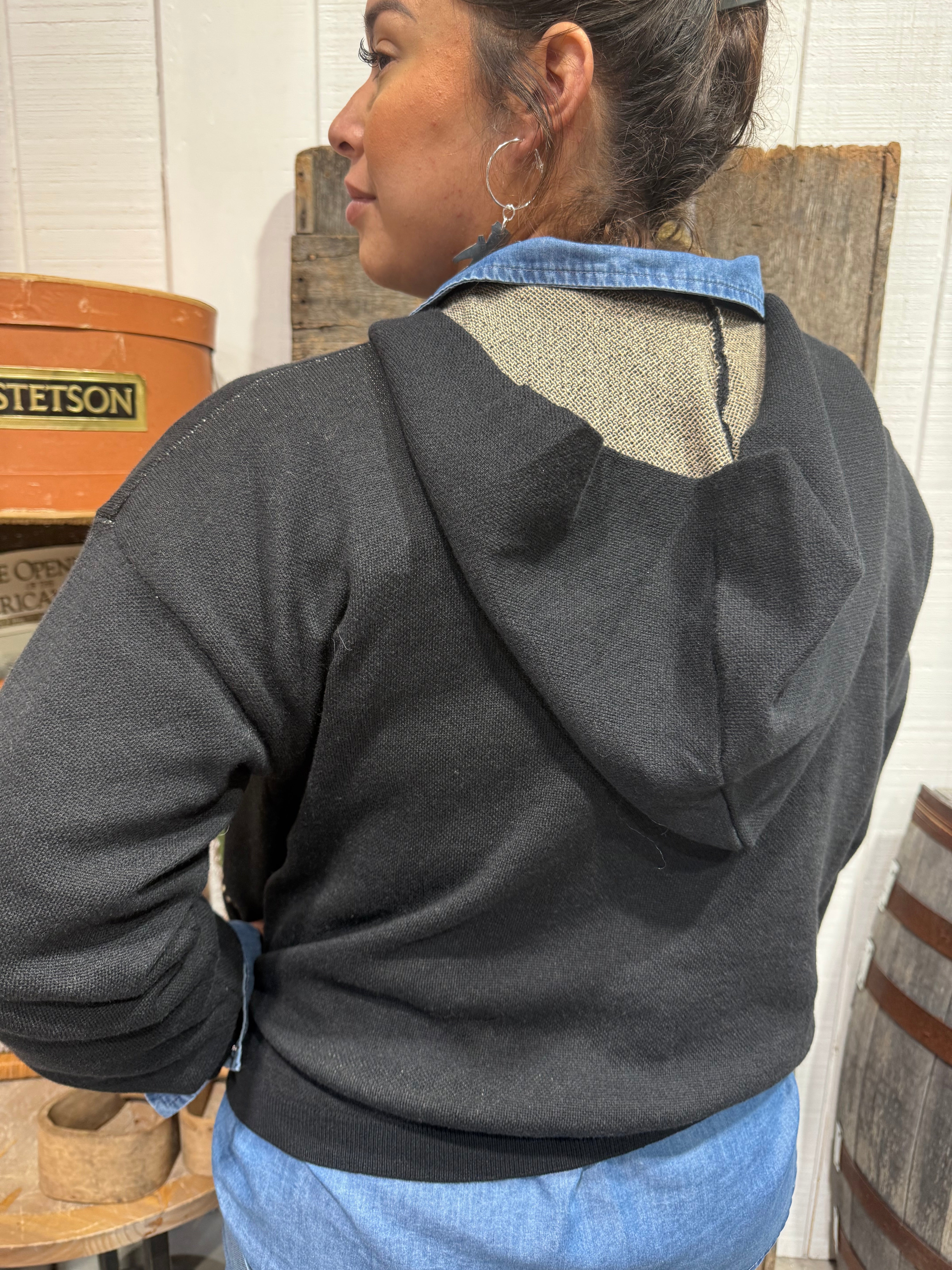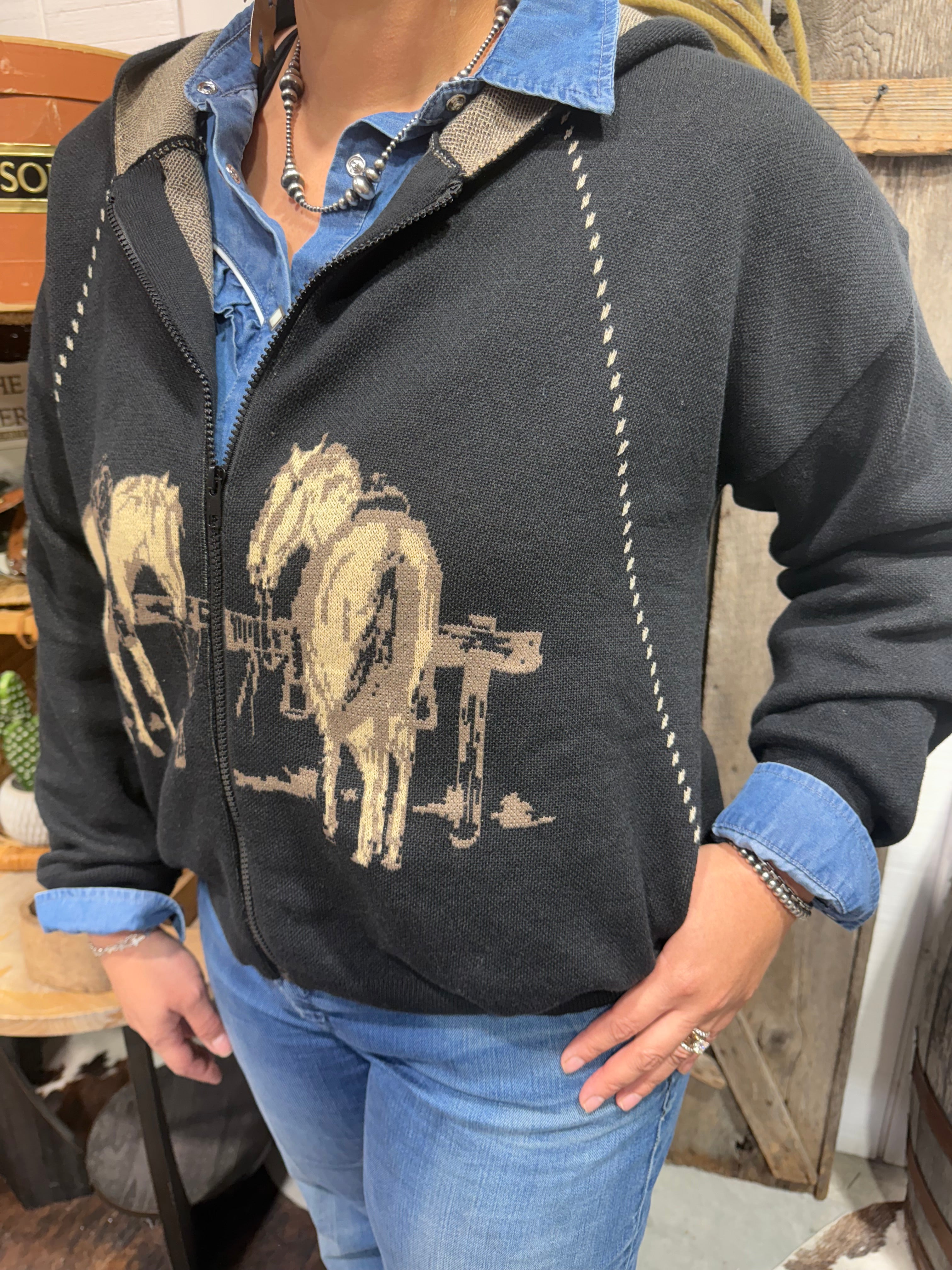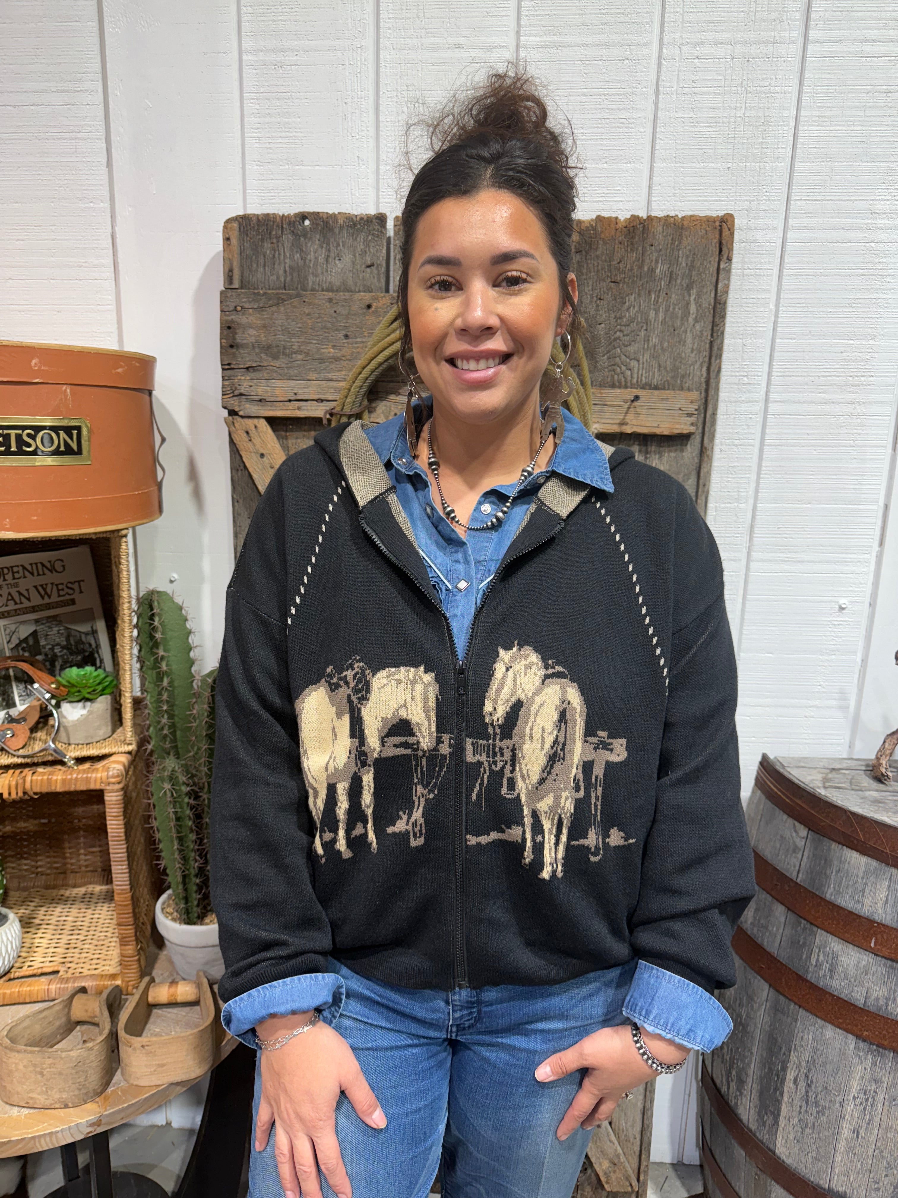 Saddle up in soft, cozy style with The Ranchita Midnight Sweater — a punchy black knit zip-up featuring a detailed woven horse graphic inspired by ranch-life sunsets and arena days. This western-chic sweater blends comfort and cowgirl charm, with contrast whipstitch detailing, a relaxed silhouette, and a warm, mid-weight feel perfect for year-round wear.