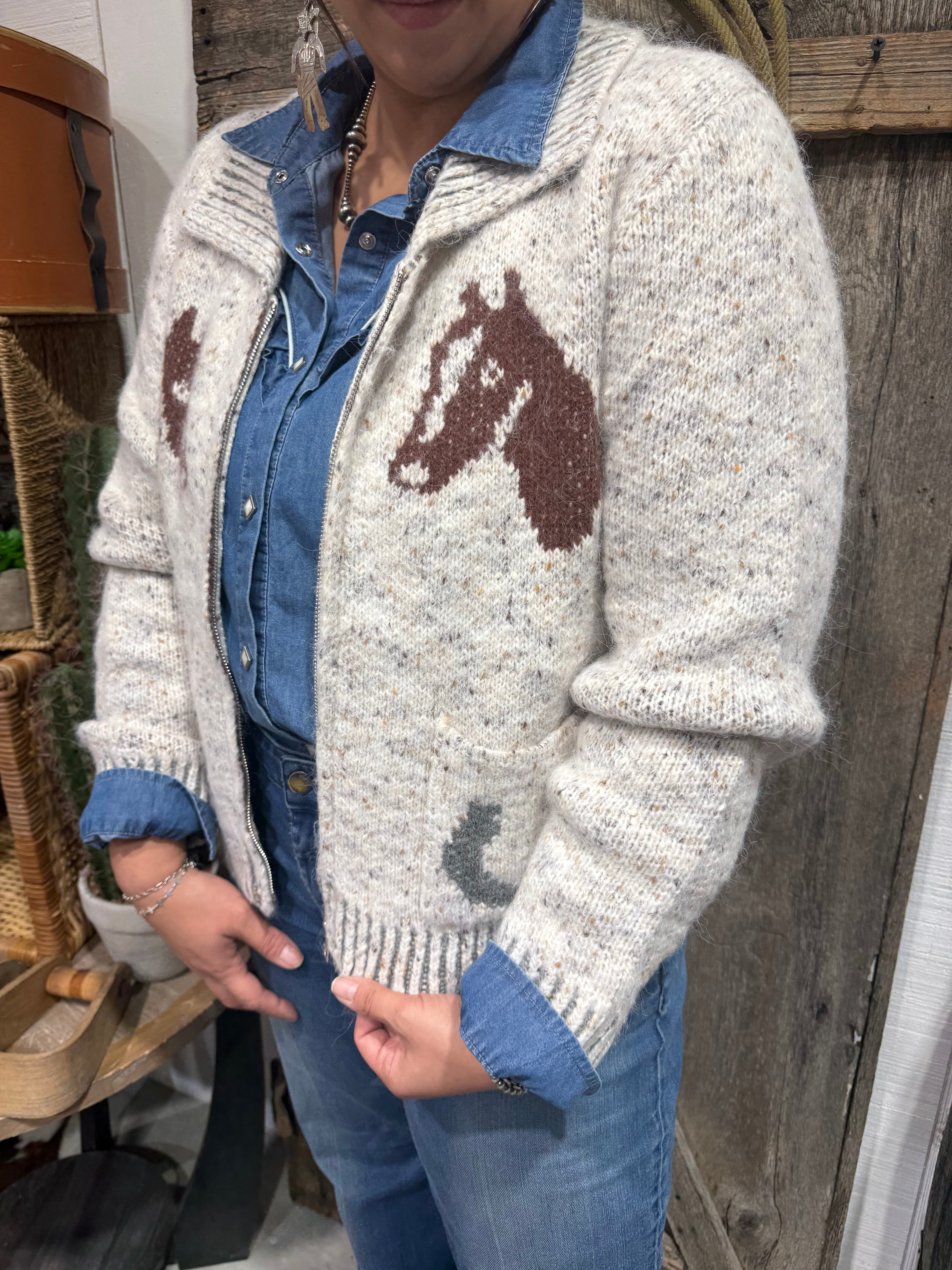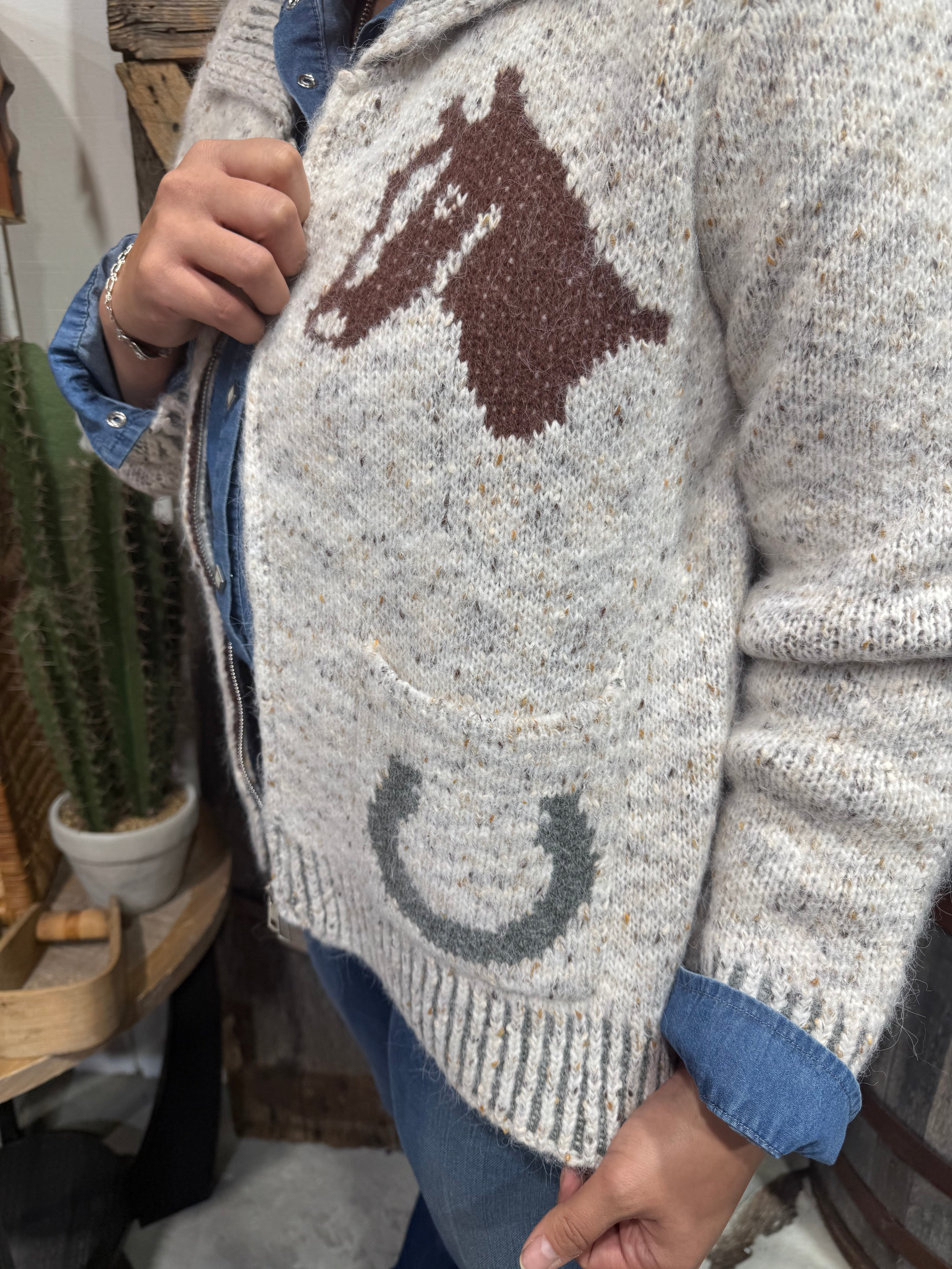 Stay warm in true western style with this cozy zip-up cardigan featuring bold horse graphics on the front and back, plus lucky horseshoe details on the pockets. Crafted from a soft speckled knit, this cowgirl-inspired sweater blends rustic charm with everyday comfort. Perfect for layering with denim or dresses, it’s a must-have statement piece for any western wardrobe.