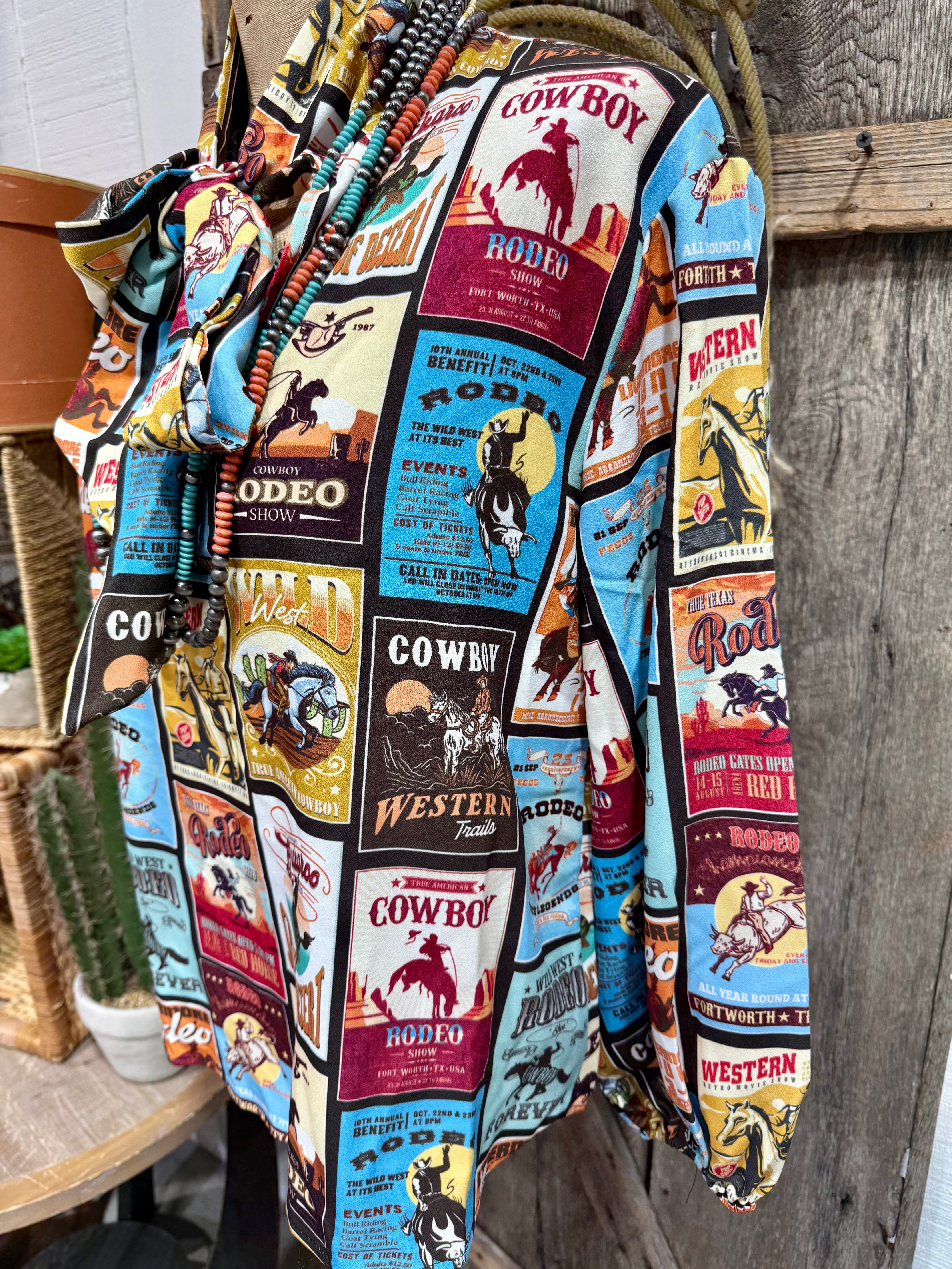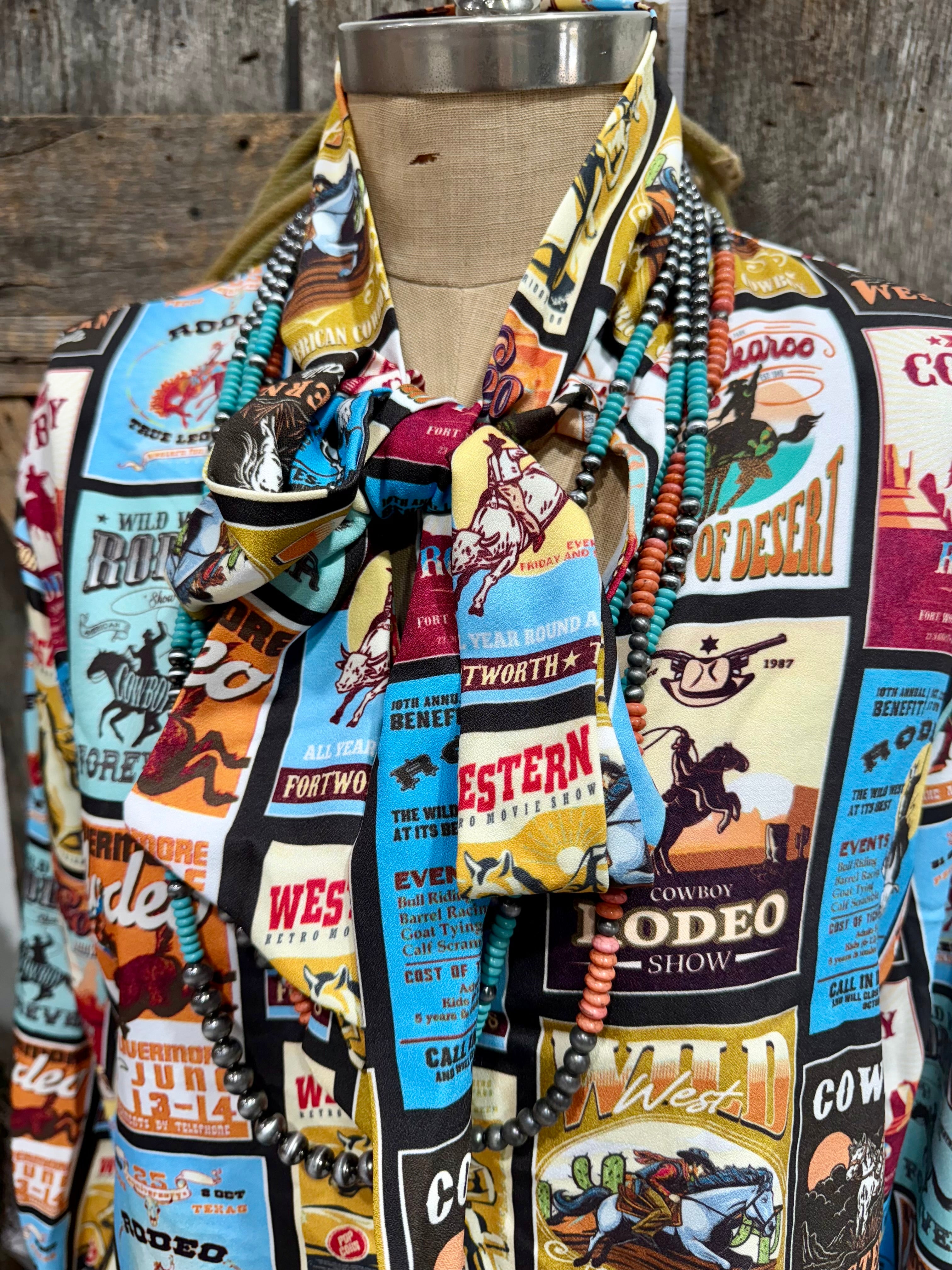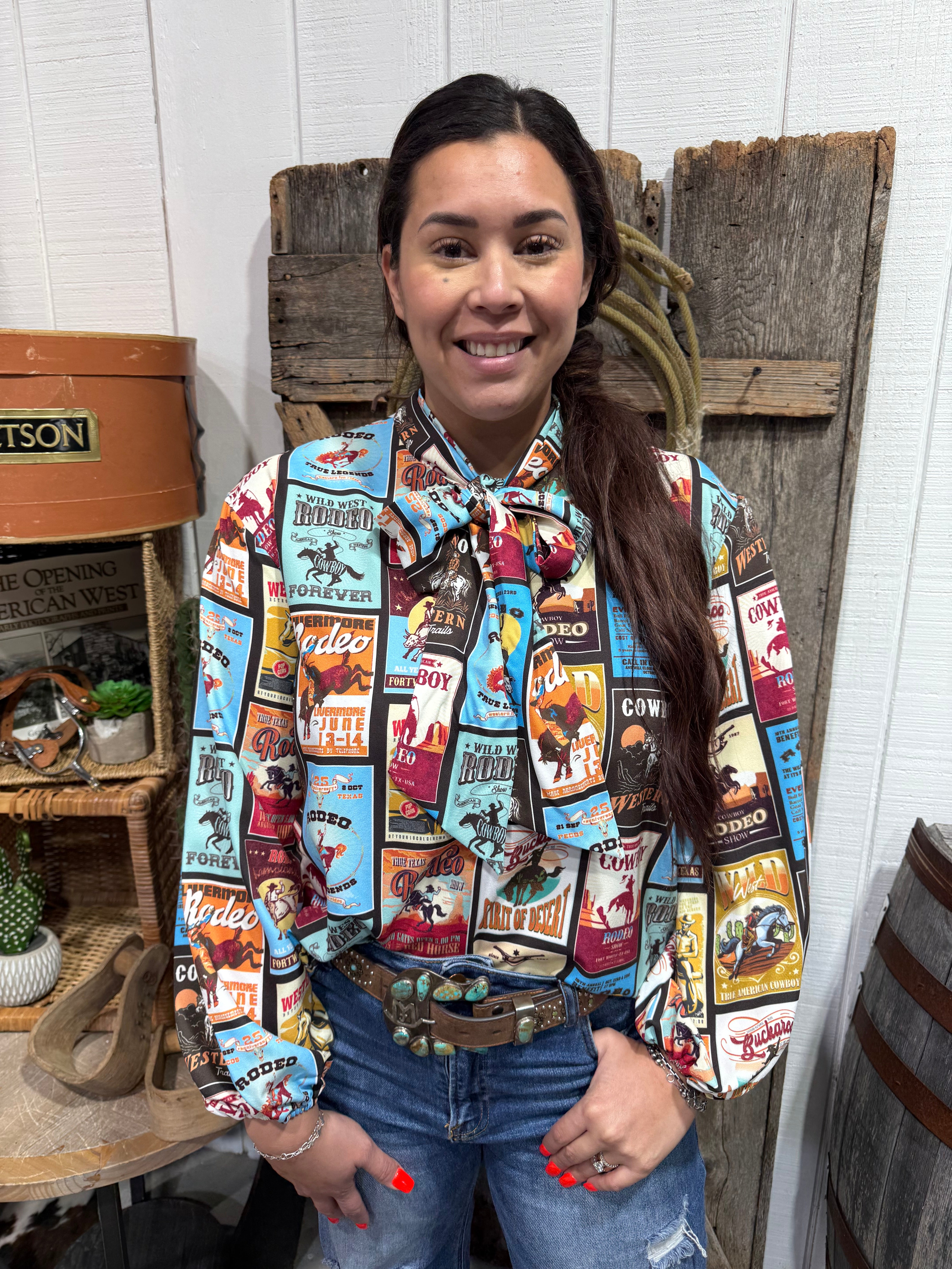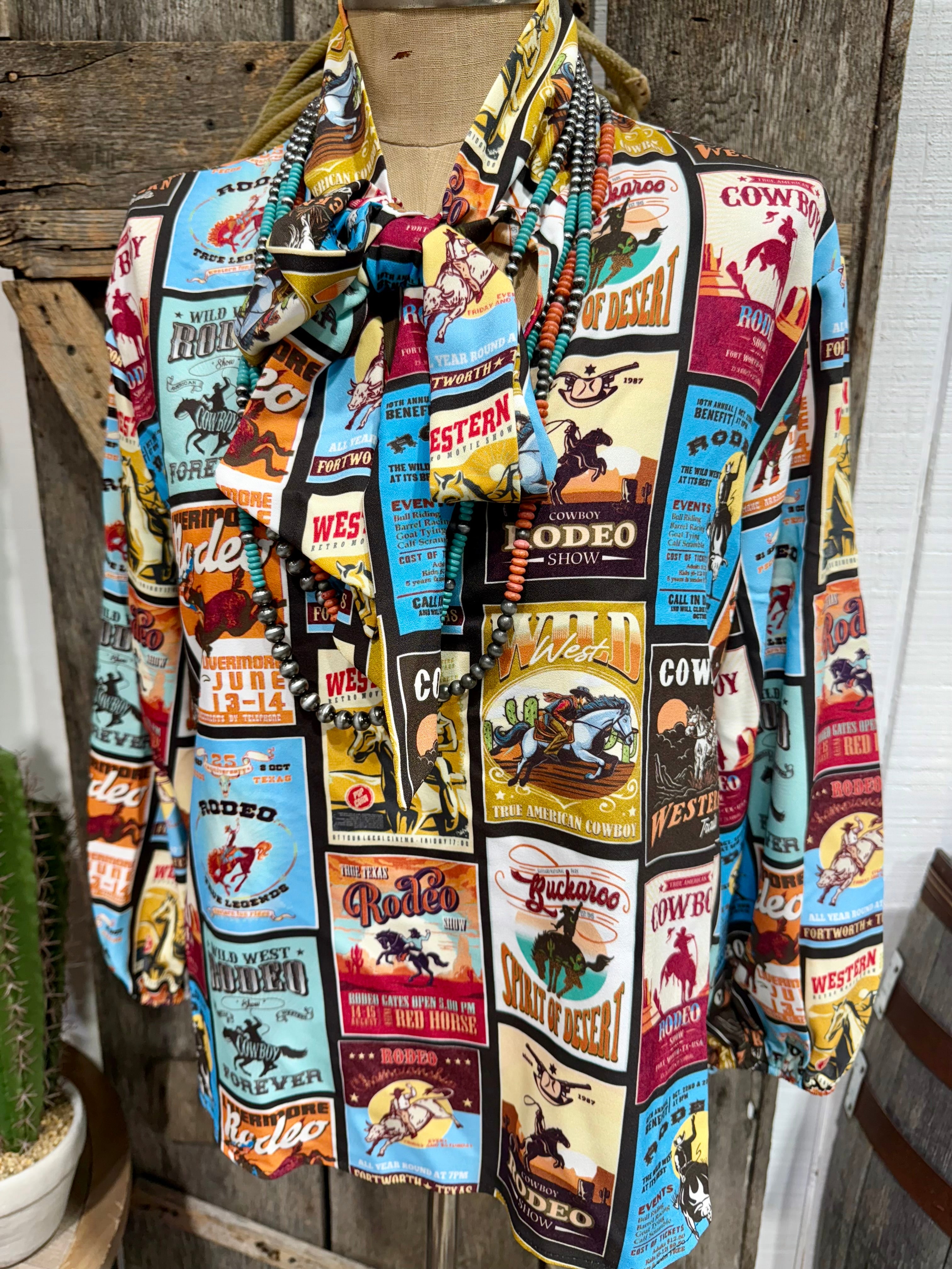 Saddle up in standout style with our Retro Western Rodeo Collage Tie-Neck Blouse — a bold, vintage-inspired top covered in old-school cowboy posters, rodeo graphics, and western desert scenes. This blouse brings classic cowgirl flair with a polished twist, featuring a soft woven fabric, elegant tie-neck detail, and billowy long sleeves with comfortable elastic cuffs.