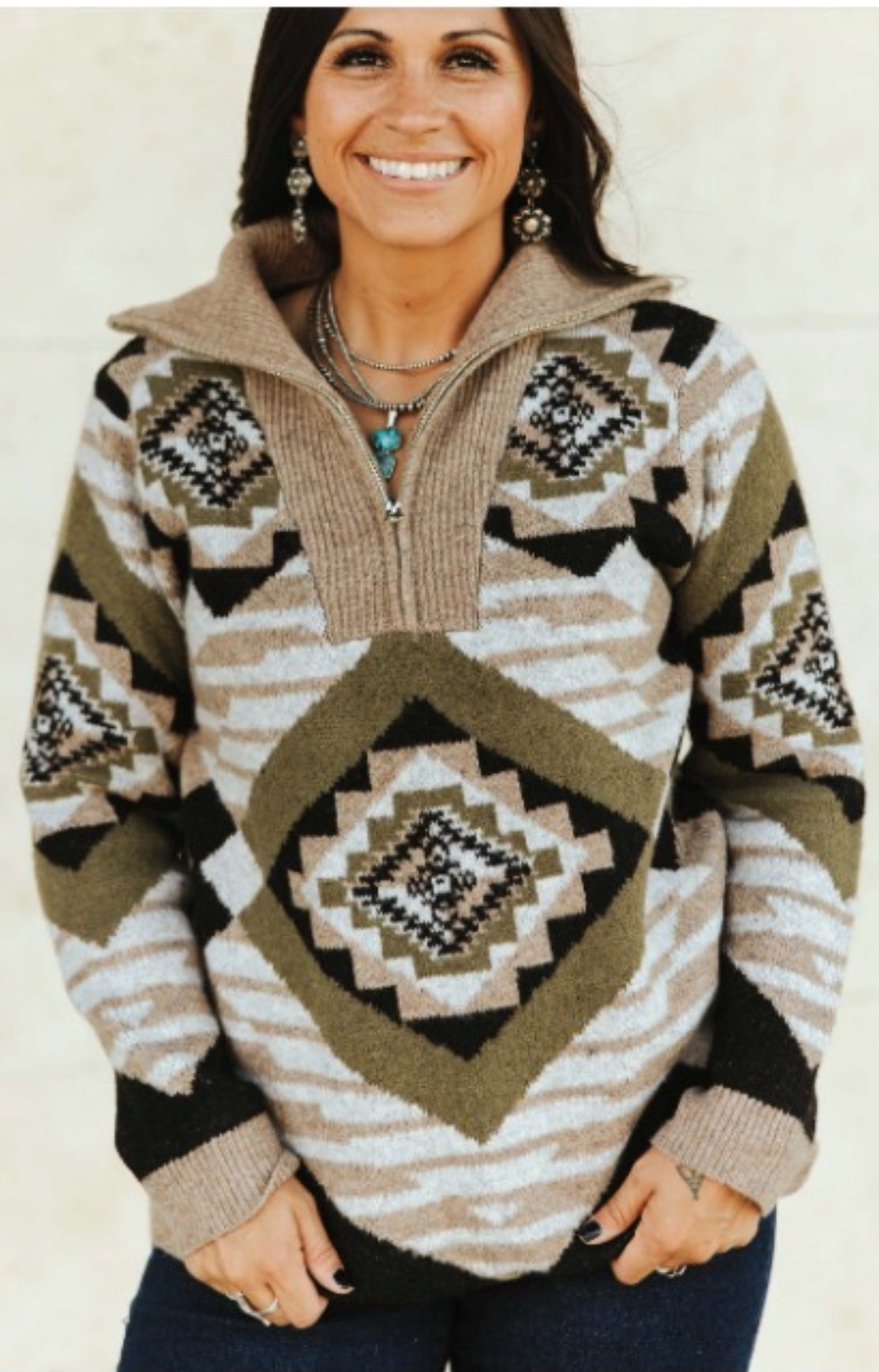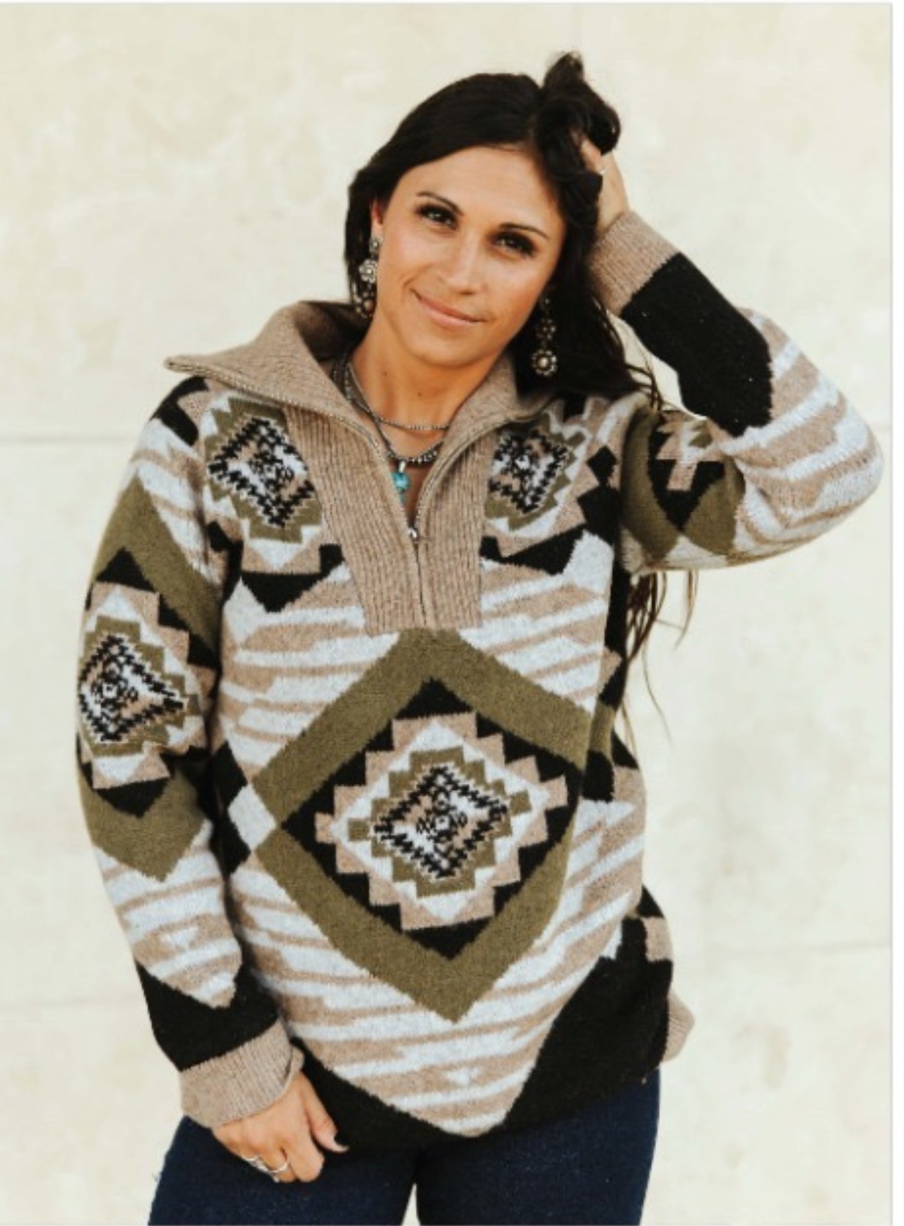 Stay warm in western style with this Aztec quarter zip pullover sweater. Featuring bold diamond patterns in earthy neutrals of brown, black, and cream, this cozy knit is perfect for ranch days, rodeo nights, or casual everyday wear. The ribbed collar, cuffs, and hem add comfort and durability, making it a must-have piece for any cowgirl’s wardrobe.